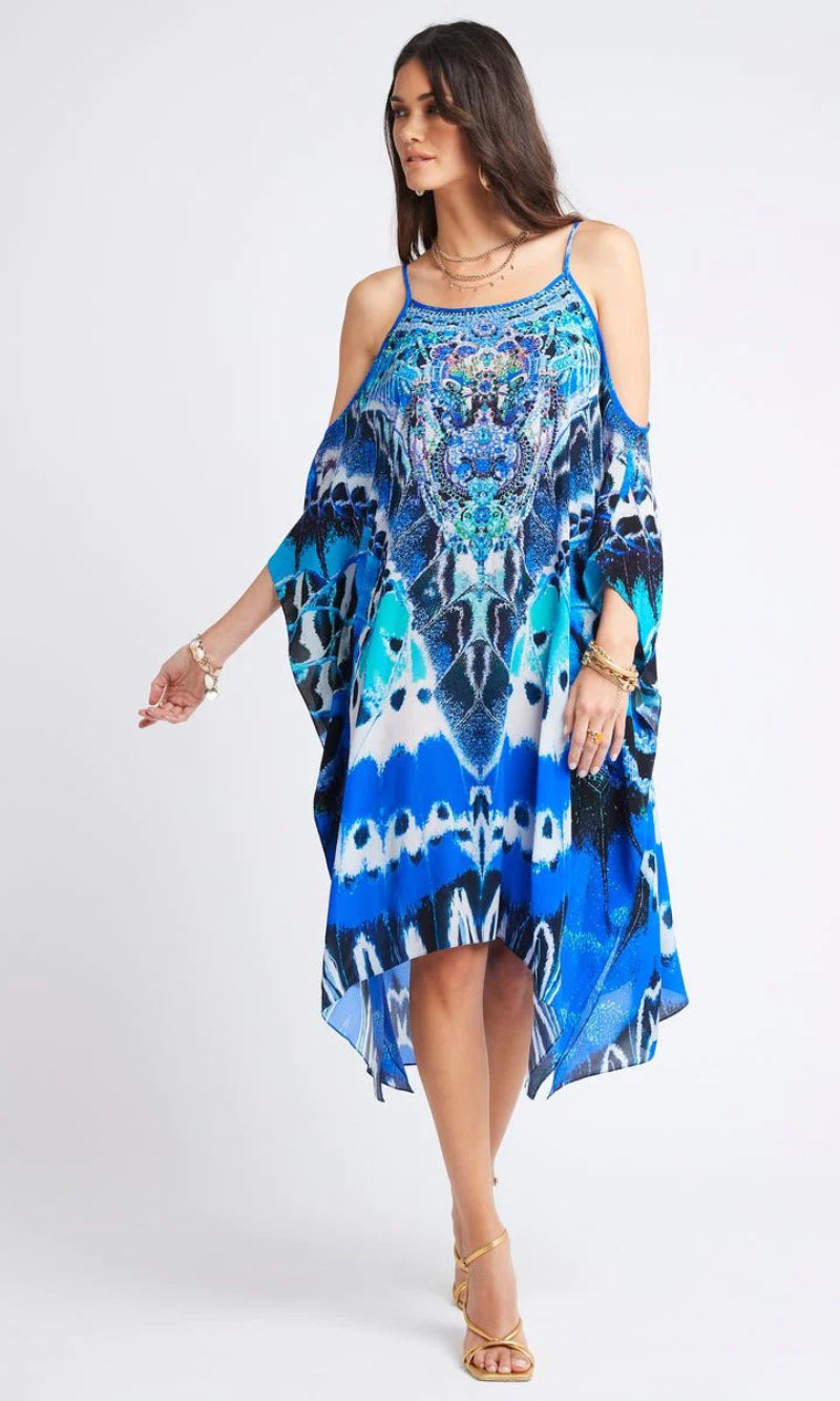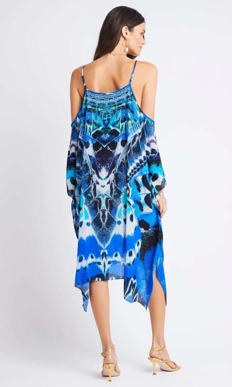 The Wild Feathers Cold Shoulder Short Kaftan Dress is a signature Czarina shape featuring floaty cut out shoulders with adjustable thin straps. Conjured in a bold, blue print with sweeping feathers, wild animal line-work and encrusted with crystal beading. Styles effortlessly with flats or heels, for day or night.