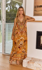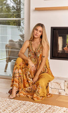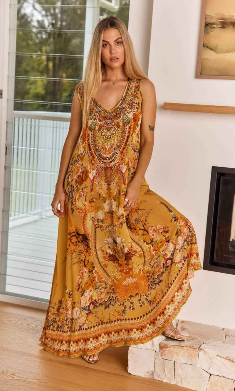 The You Are My Sunshine Maxi Dress features a subtle and flattering v-neck design, with a loose & flowing shape. Flattering to all shapes, and crafted from a viscose/silk blend that allows the skin to breathe.