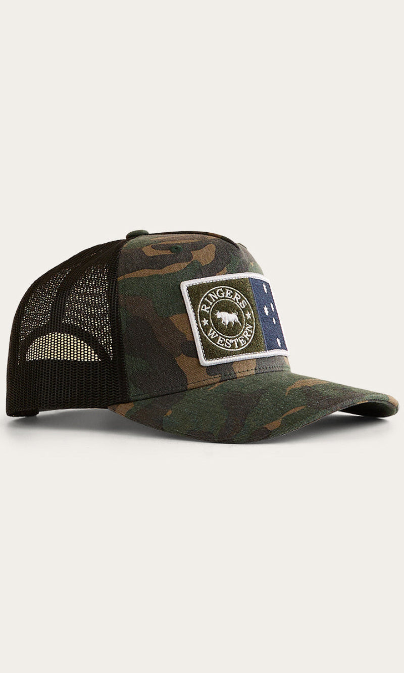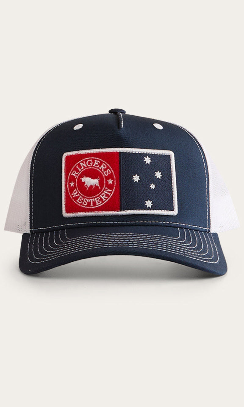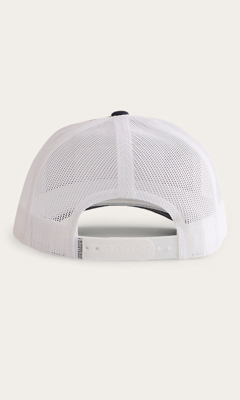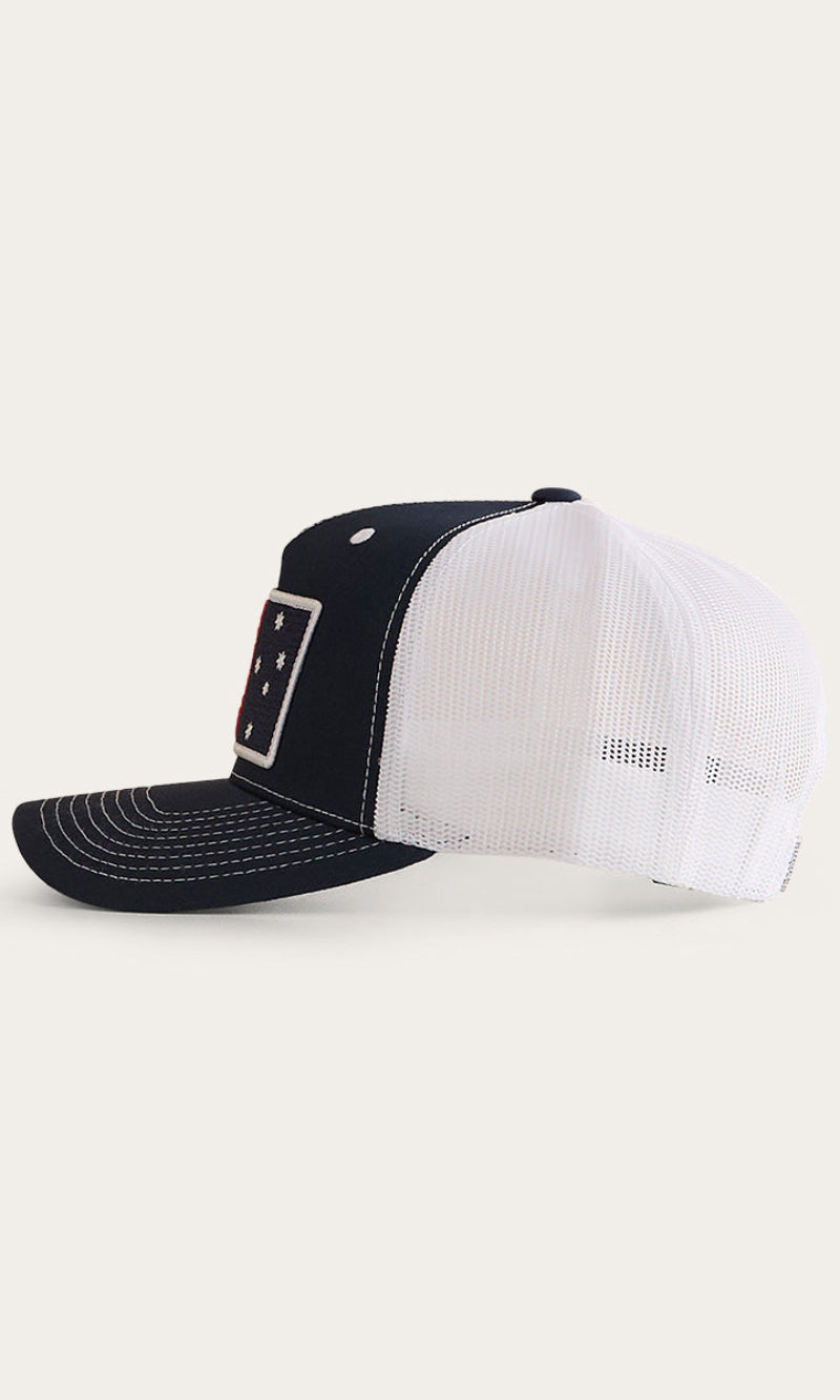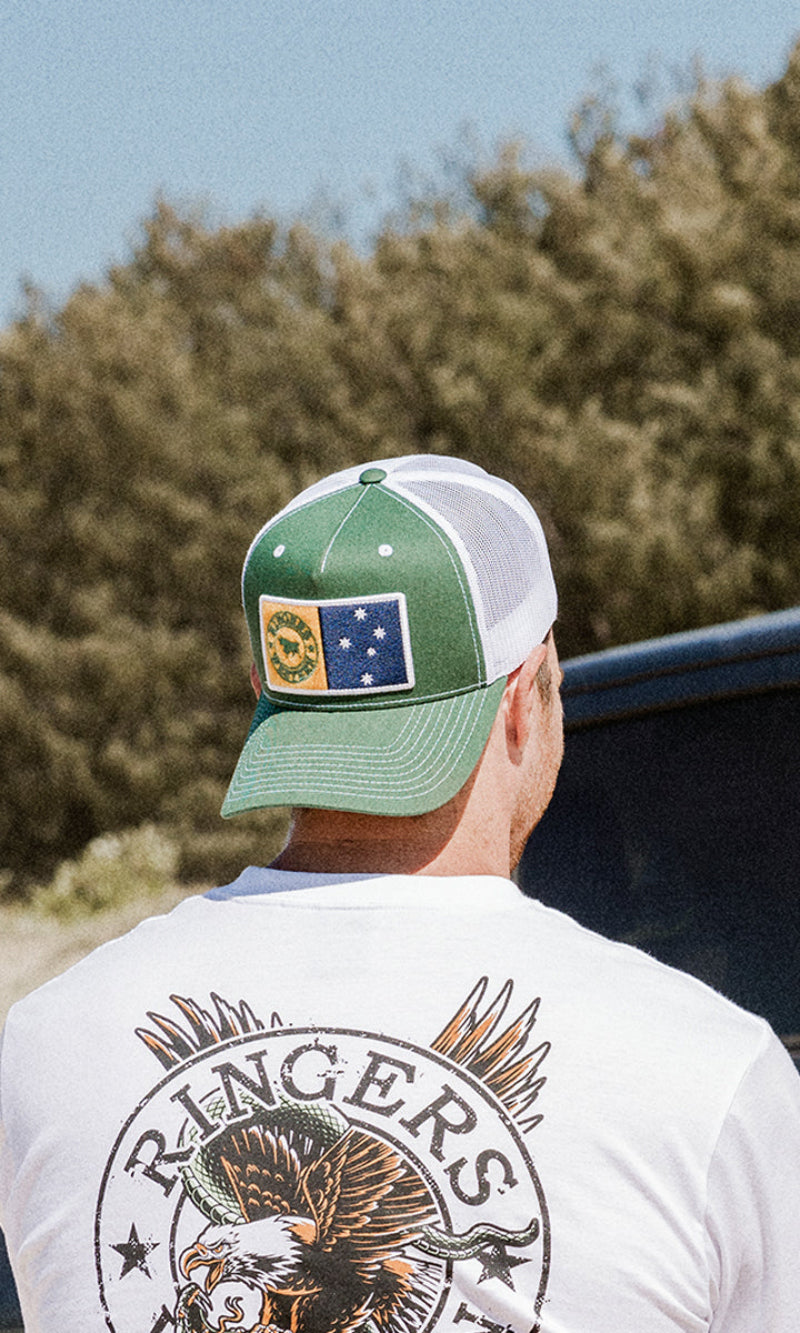 Introducing the Southern Son trucker, this cap is a mid profile design proudly featuring the Ringers Western logo alongside the Southern Cross on an embroidered patch. This cap has a mesh back for optimal ventilation, ensuring all day comfort on hot summer days. The adjustable snapback provides a customisable and comfortable fit. Whether you're out travelling the open road, attending a local festival, or just representing the brand, our trucker caps have you covered.