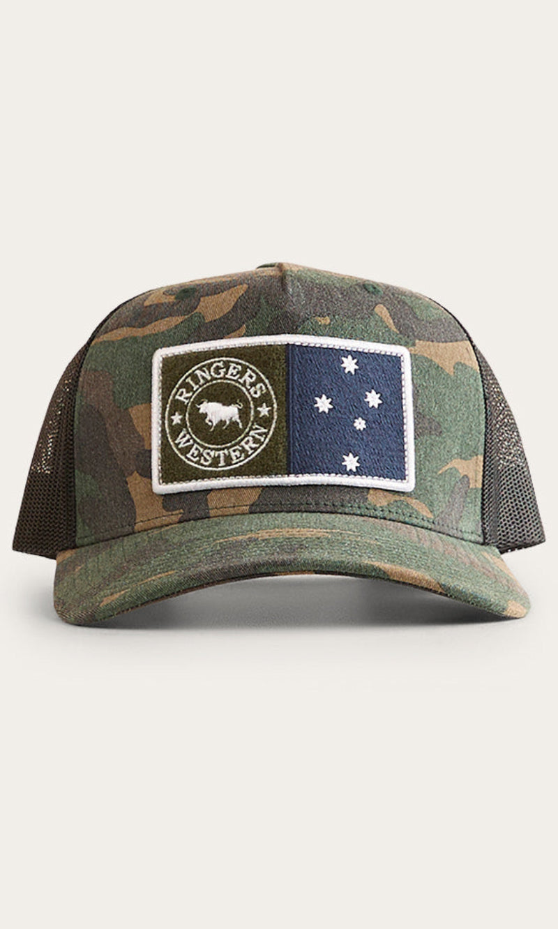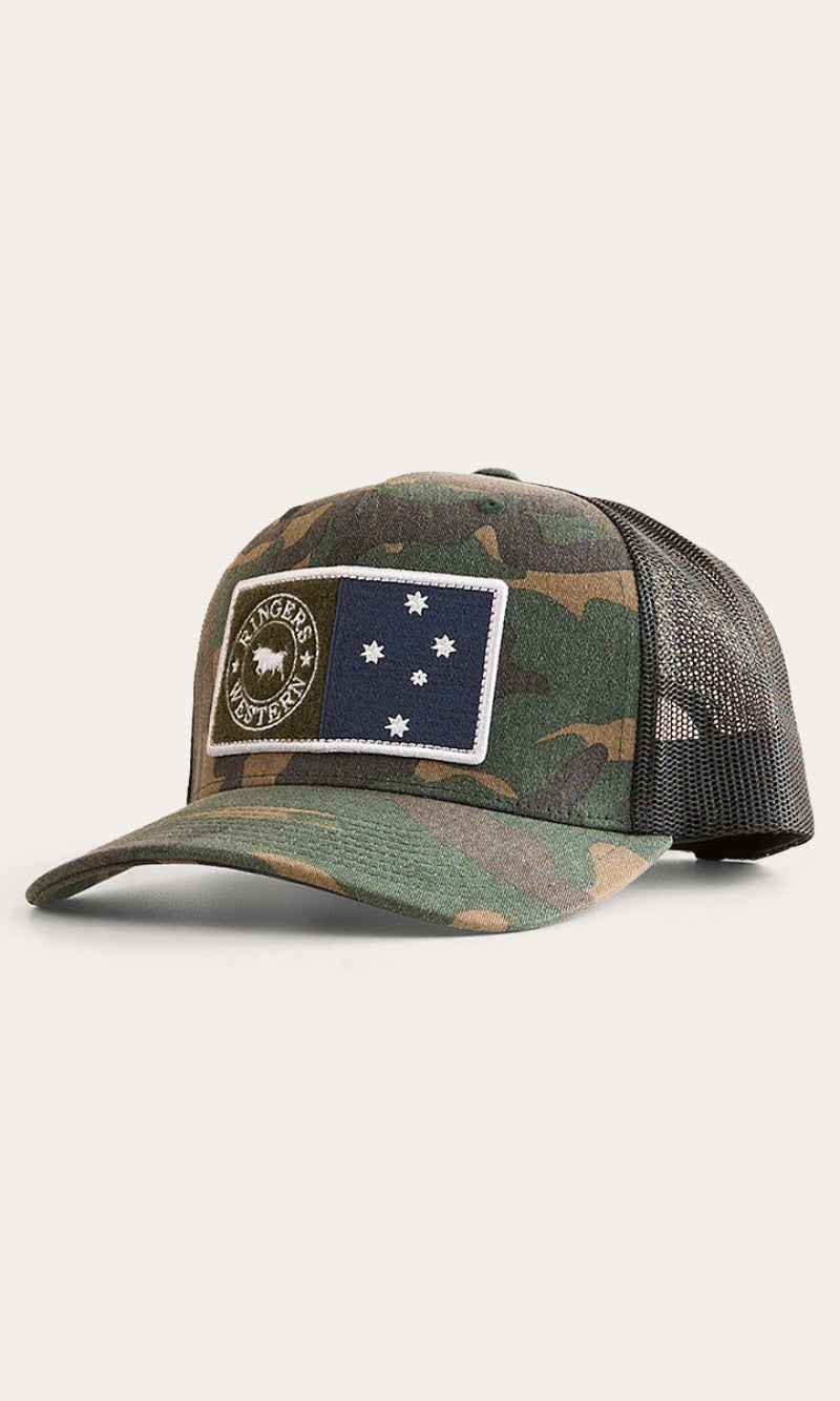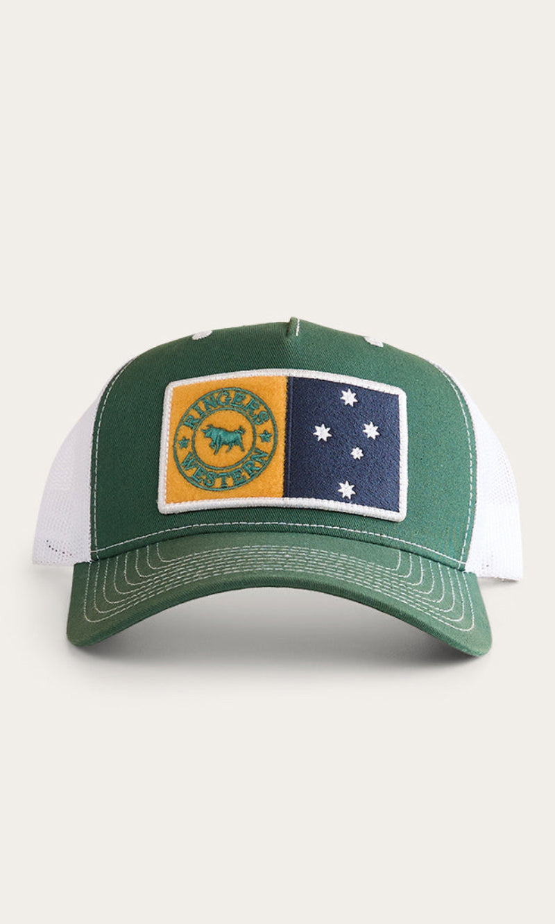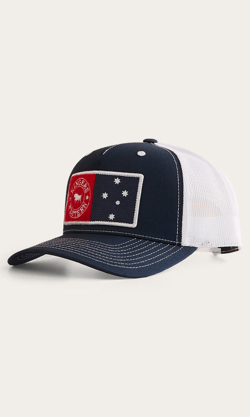 Introducing the Southern Son trucker, this cap is a mid profile design proudly featuring the Ringers Western logo alongside the Southern Cross on an embroidered patch. This cap has a mesh back for optimal ventilation, ensuring all day comfort on hot summer days. The adjustable snapback provides a customisable and comfortable fit. Whether you're out travelling the open road, attending a local festival, or just representing the brand, our trucker caps have you covered.