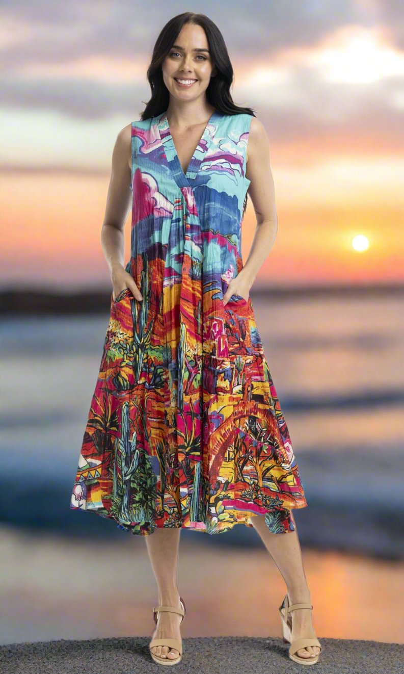 Make a vibrant statement with our stunning Ocampo dress. Featuring a round neckline, short sleeves, and gathered waist seam that falls into a knee length skirt, this dress showcases beautiful patterns perfect for summer. Its flowing silhouette offers both comfort and style, making it ideal for beach outings and leisurely strolls. The perfect effortless summer dress!