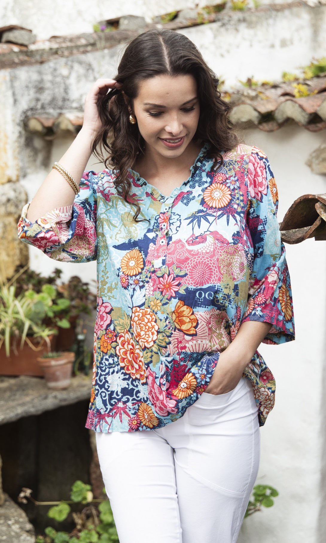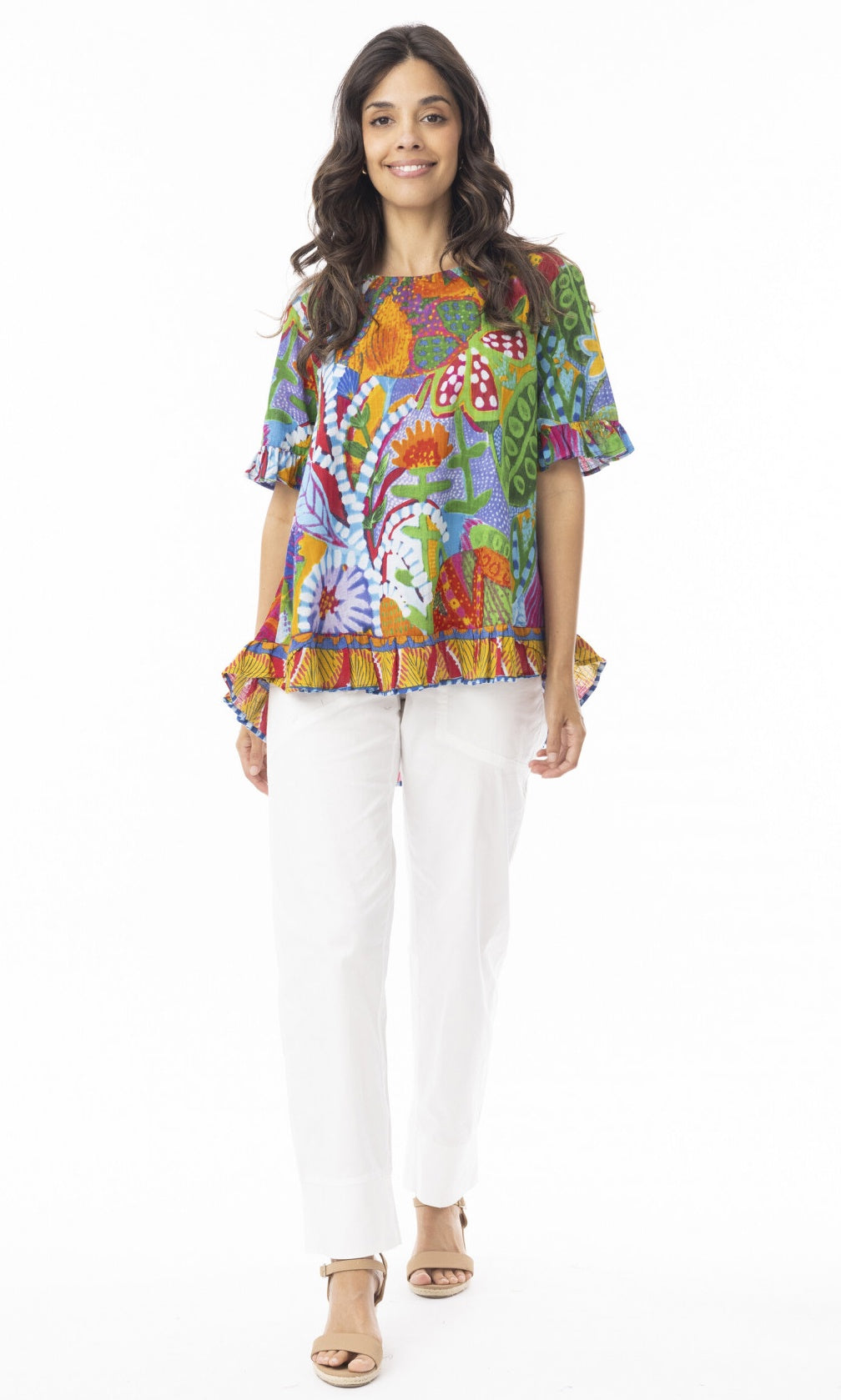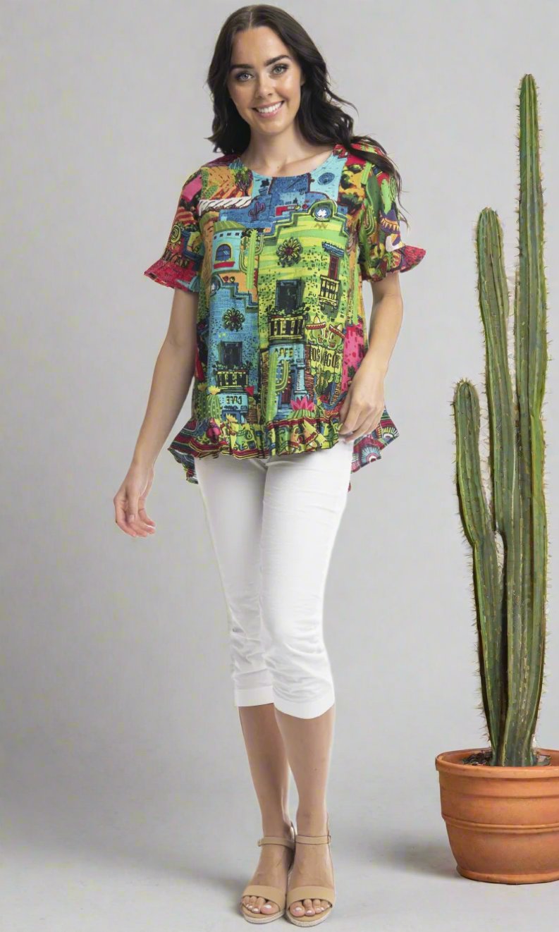 Add a splash of colour to your look with our Torgua top. Featuring a relaxed fit, it showcases a gorgeous prints and colour. The playful ruffled sleeves and hem add a touch of whimsy, while the breathable fabric ensures all-day comfort. Perfectly paired with your favourite trousers or capris for a chic summer look.