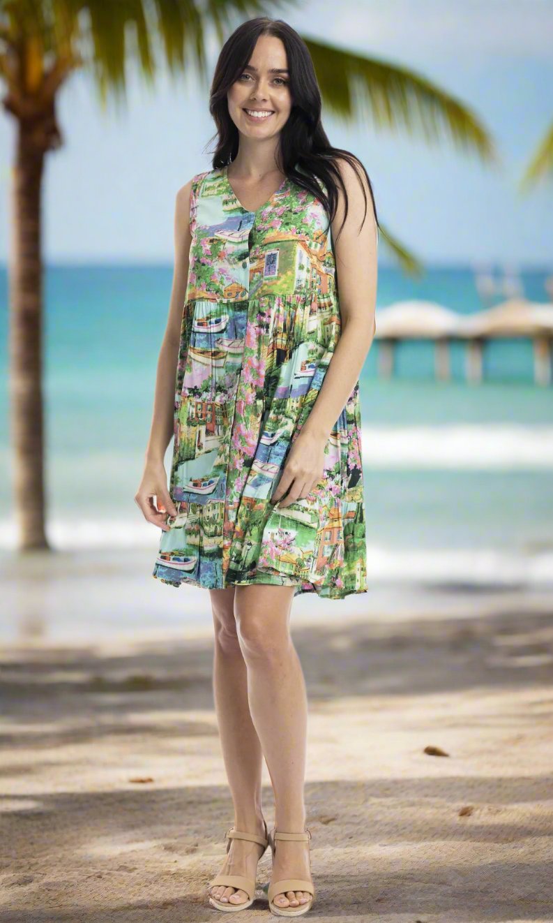 Crinkle Rayon Dress Godet Short Sleeve Bellagio