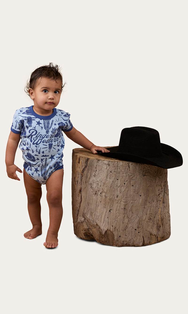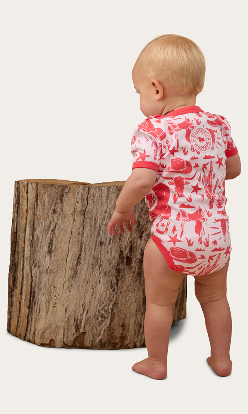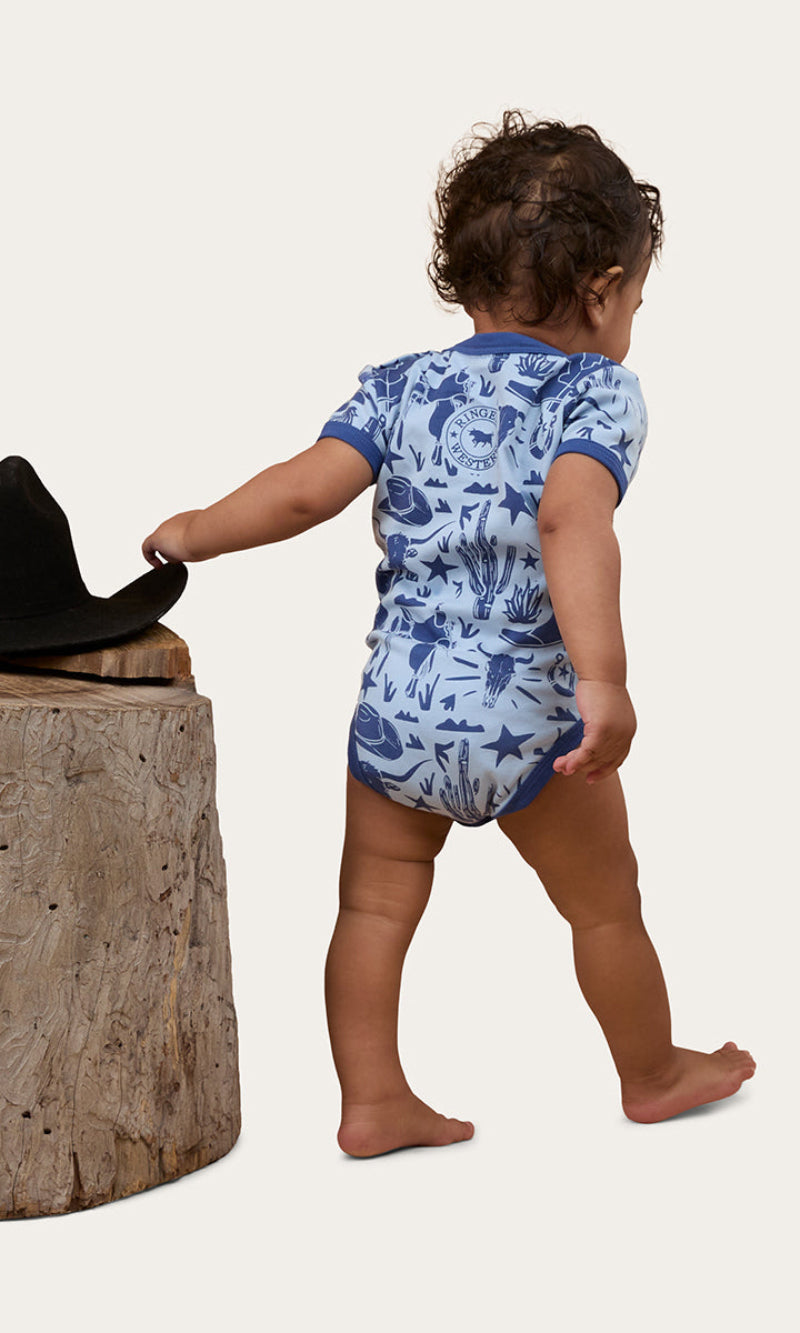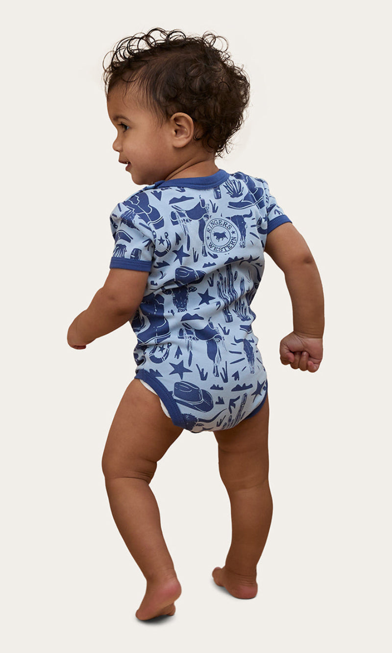 The Boot Scootin Babies Short Sleeve Romper has been thoughtfully created from 100% premium cotton, a fabric praised for it's superior breathability and softness - perfect against babies delicate skin. This delightful romper features snap button closures at the shoulder and crotch, making unexpected outfit and nappy changes a breeze. The relaxed fitting style features a signature Ringers Western allover yardage print, a fun and lively celebration of the wild west that is perfectly complemented by contrast binding. Get bub rodeo ready with the Boot Scootin Babies Short Sleeve Romper, a sweet and comfortable addition to every mini cowboy and cowgirls collection.