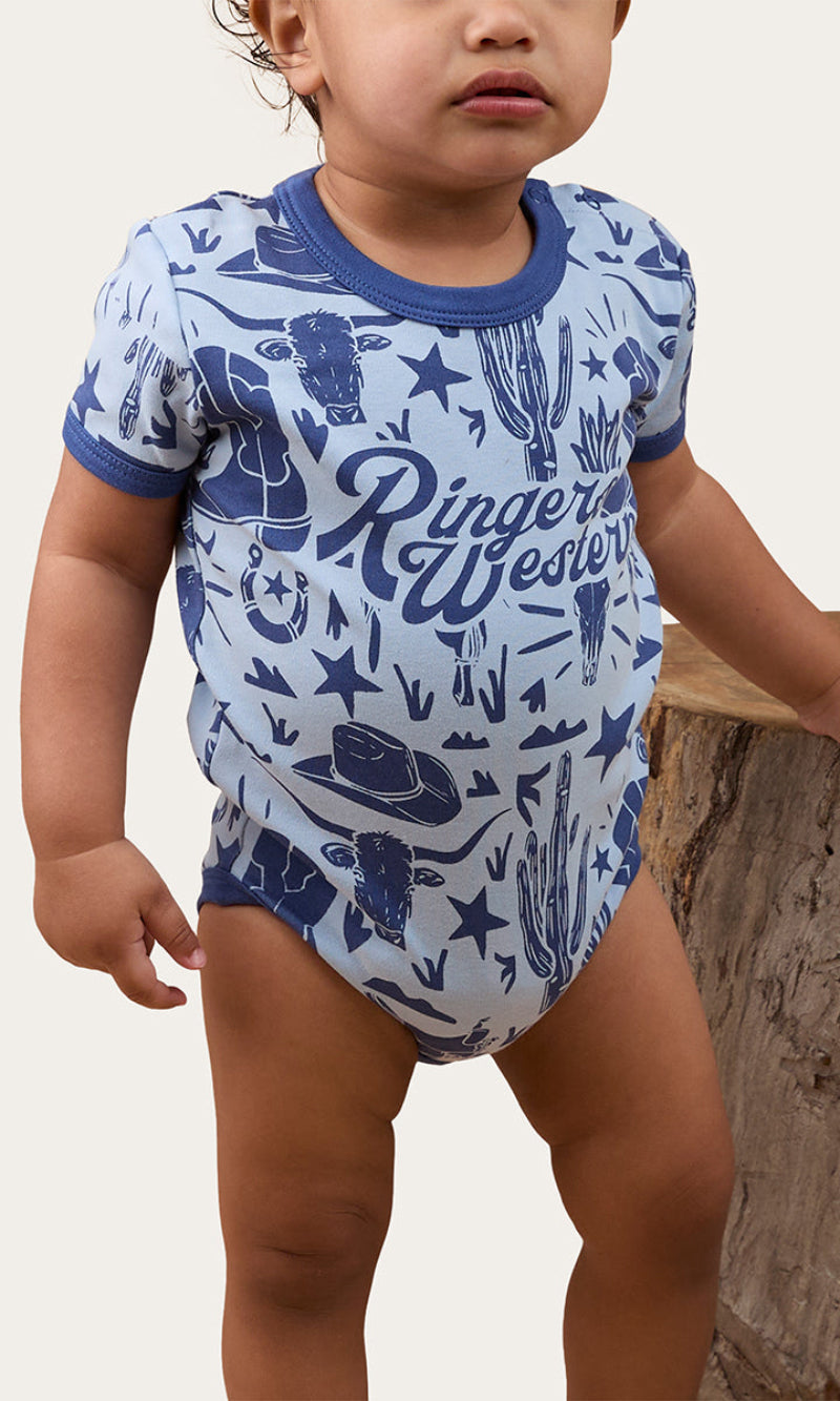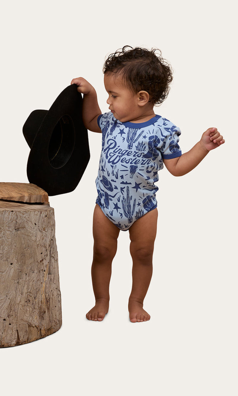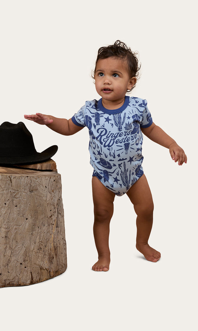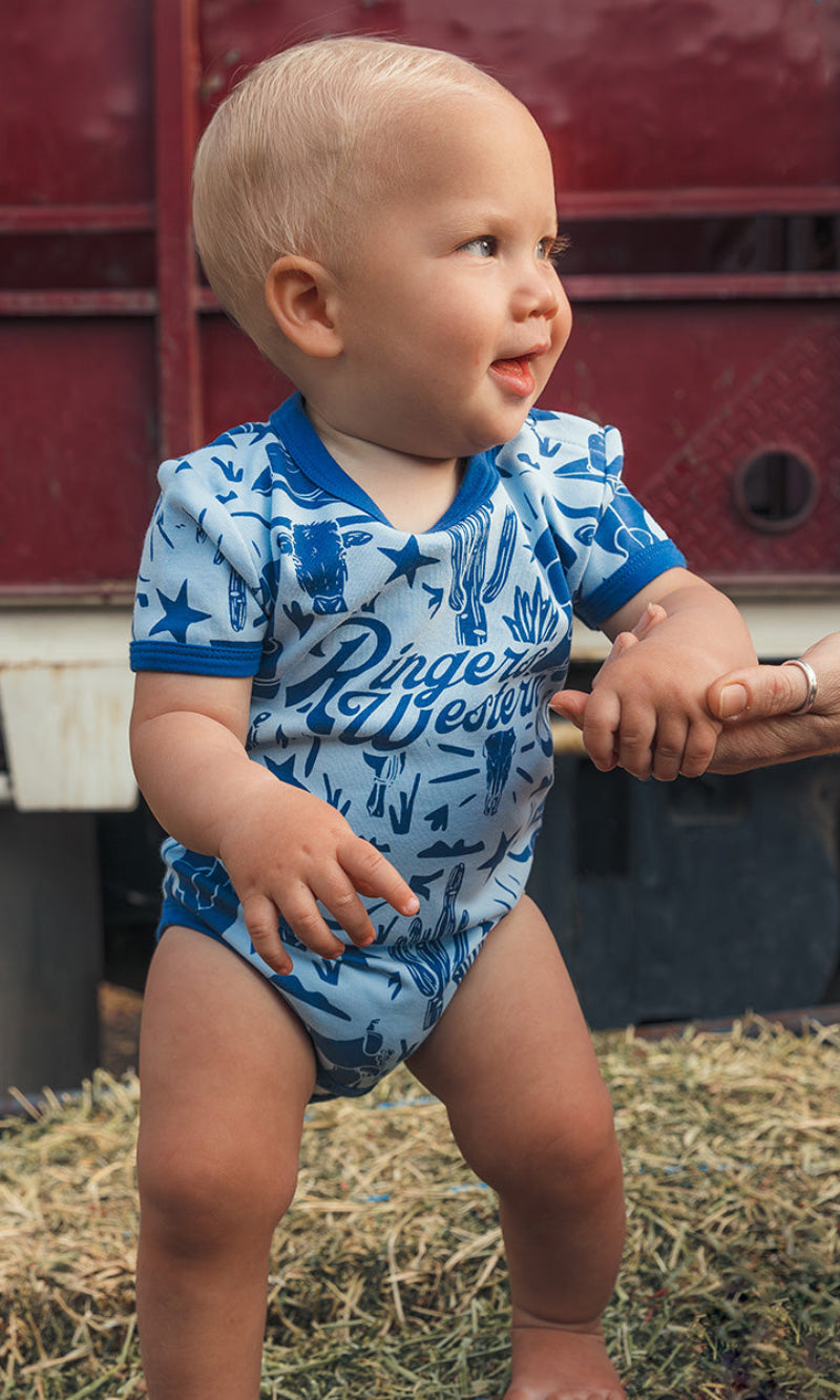 The Boot Scootin Babies Short Sleeve Romper has been thoughtfully created from 100% premium cotton, a fabric praised for it's superior breathability and softness - perfect against babies delicate skin. This delightful romper features snap button closures at the shoulder and crotch, making unexpected outfit and nappy changes a breeze. The relaxed fitting style features a signature Ringers Western allover yardage print, a fun and lively celebration of the wild west that is perfectly complemented by contrast binding. Get bub rodeo ready with the Boot Scootin Babies Short Sleeve Romper, a sweet and comfortable addition to every mini cowboy and cowgirls collection.