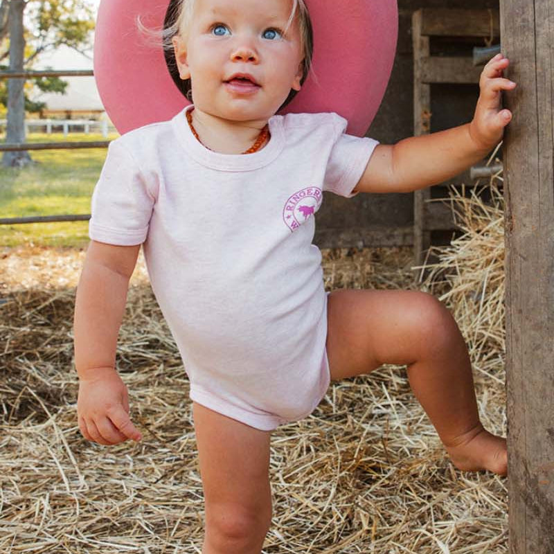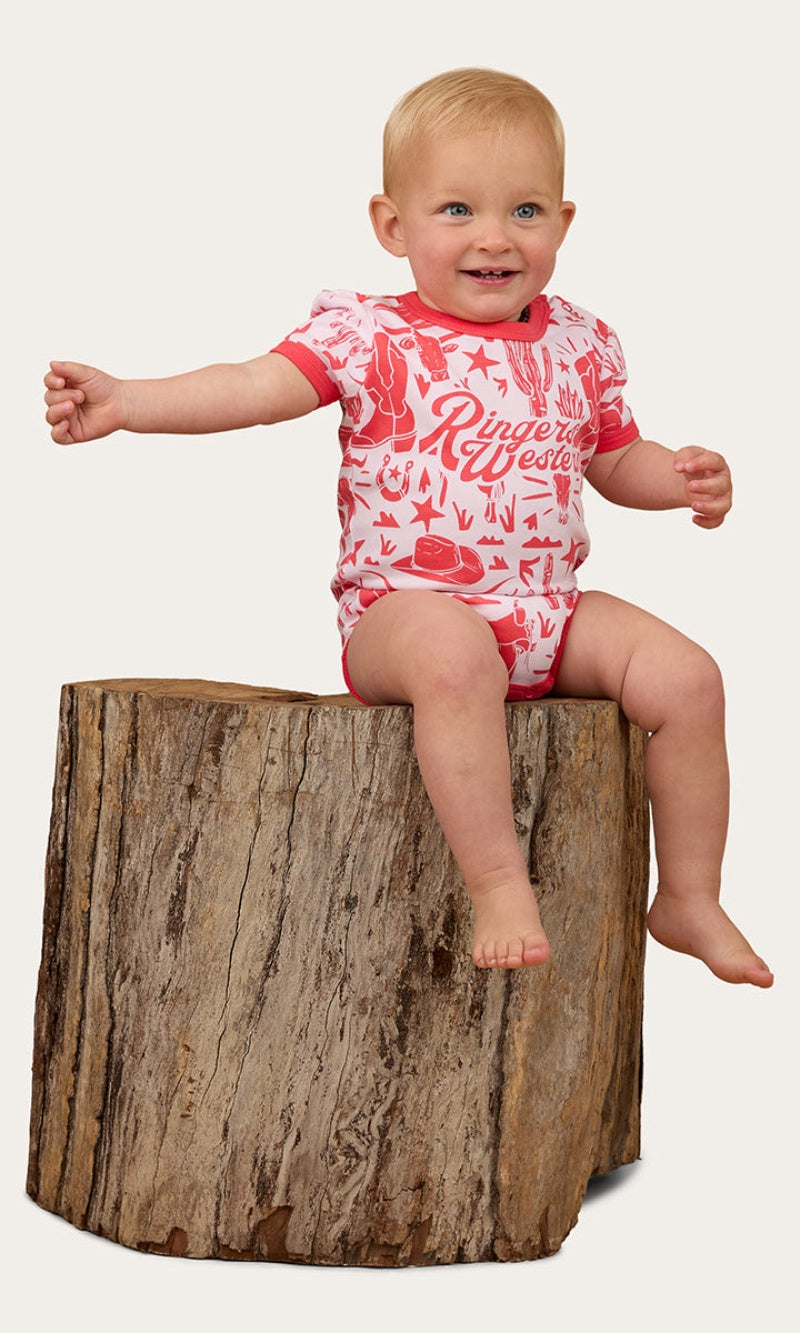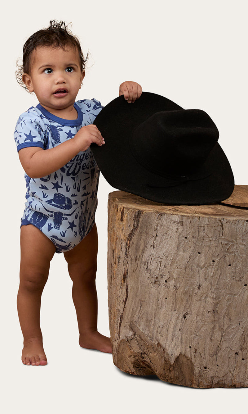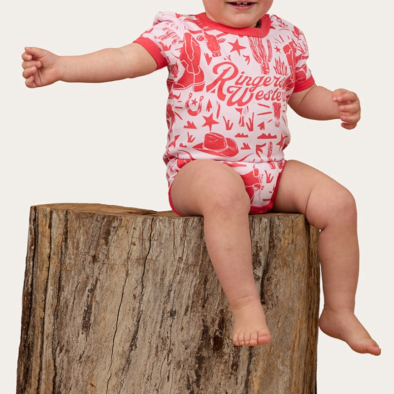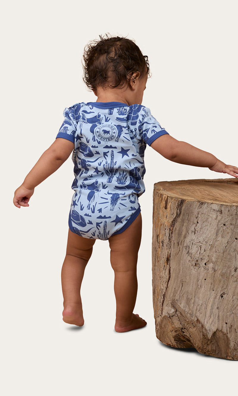 The Boot Scootin Babies Short Sleeve Romper has been thoughtfully created from 100% premium cotton, a fabric praised for it's superior breathability and softness - perfect against babies delicate skin. This delightful romper features snap button closures at the shoulder and crotch, making unexpected outfit and nappy changes a breeze. The relaxed fitting style features a signature Ringers Western allover yardage print, a fun and lively celebration of the wild west that is perfectly complemented by contrast binding. Get bub rodeo ready with the Boot Scootin Babies Short Sleeve Romper, a sweet and comfortable addition to every mini cowboy and cowgirls collection.