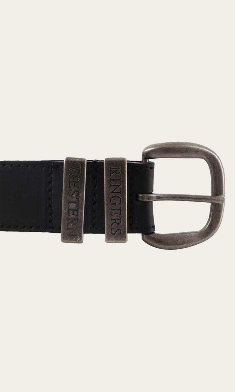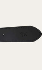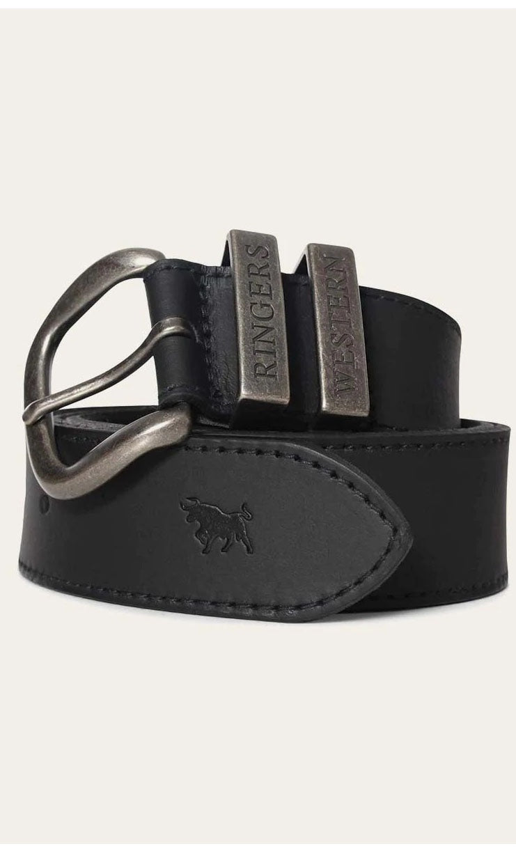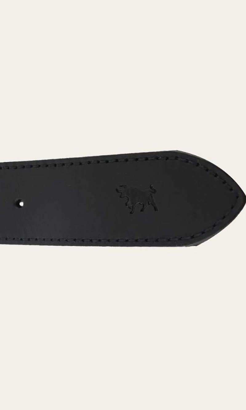 Made from black leather and silver matte brass, The James Belt in black is the perfect corporate and dress belt. Featuring subtle embossed signature bull on the tail and intricate Ringers Western engraving for a luxurious finish.