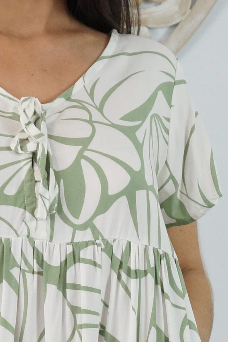 Features V neckline and capped sleeves, pockets along with a wide frilled hem.