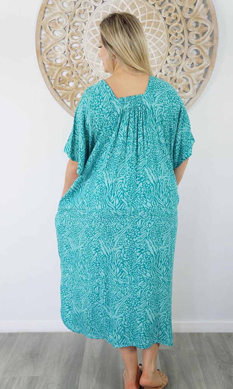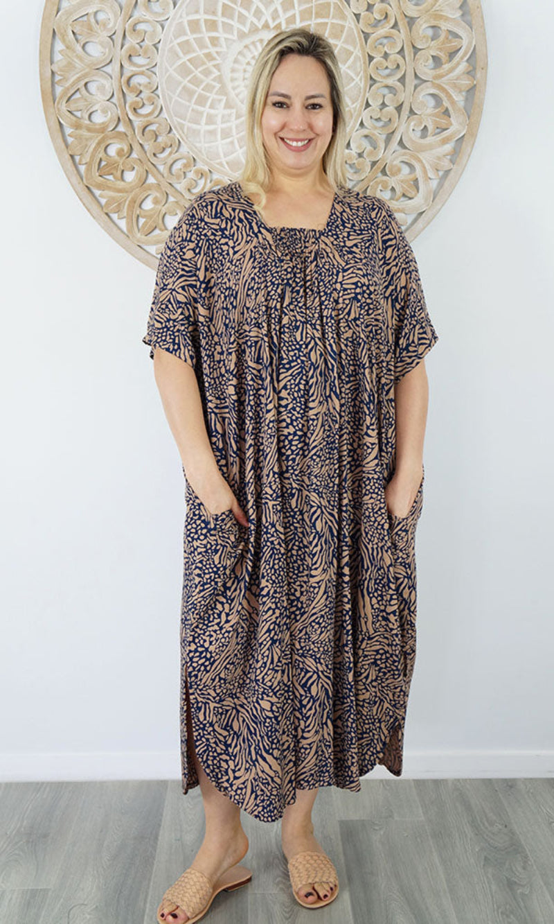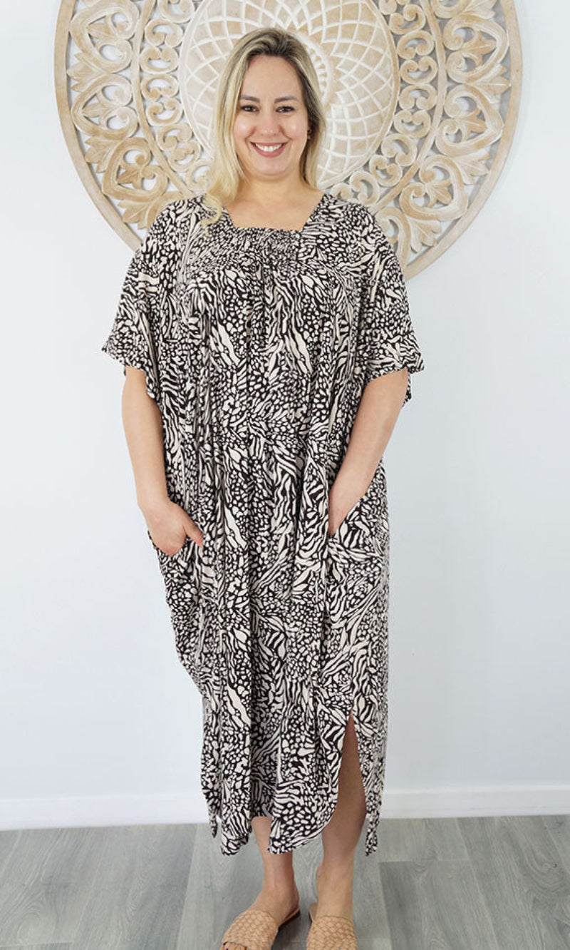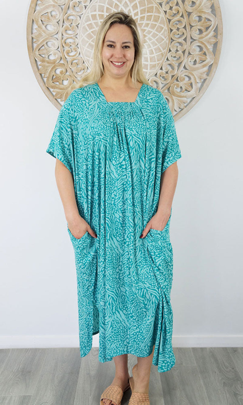 Introducing the Bermuda Kaftan in our "Kerala" print. This is a long, plus size kaftan featuring front shirring, side pockets and splits.