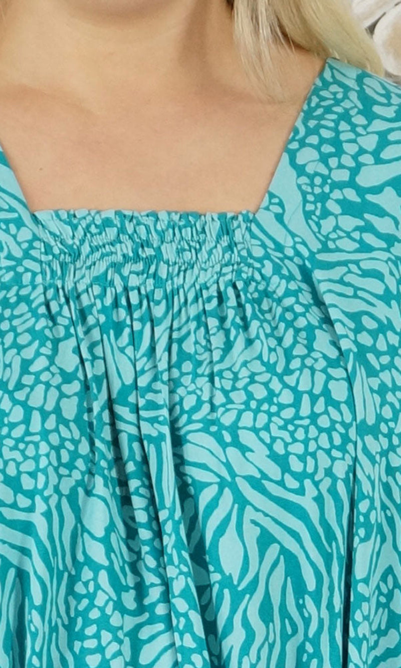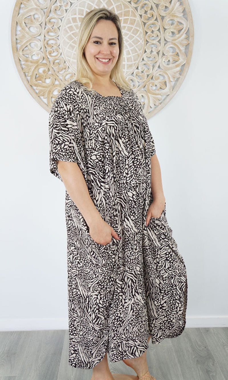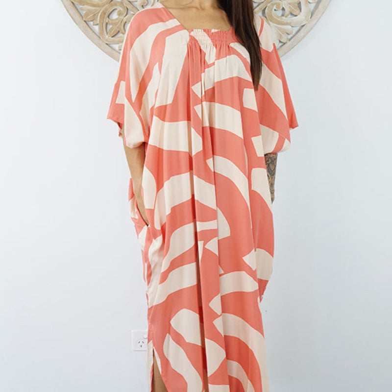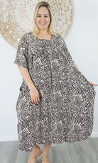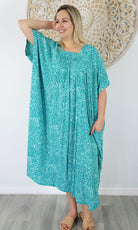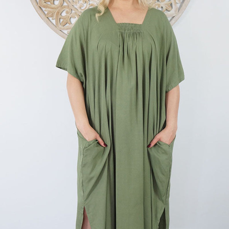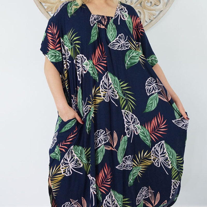 Introducing the Bermuda Kaftan in our "Kerala" print. This is a long, plus size kaftan featuring front shirring, side pockets and splits.