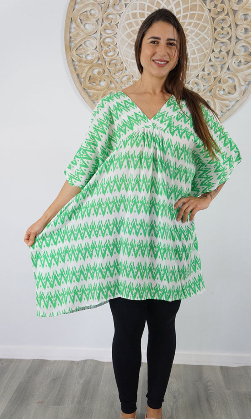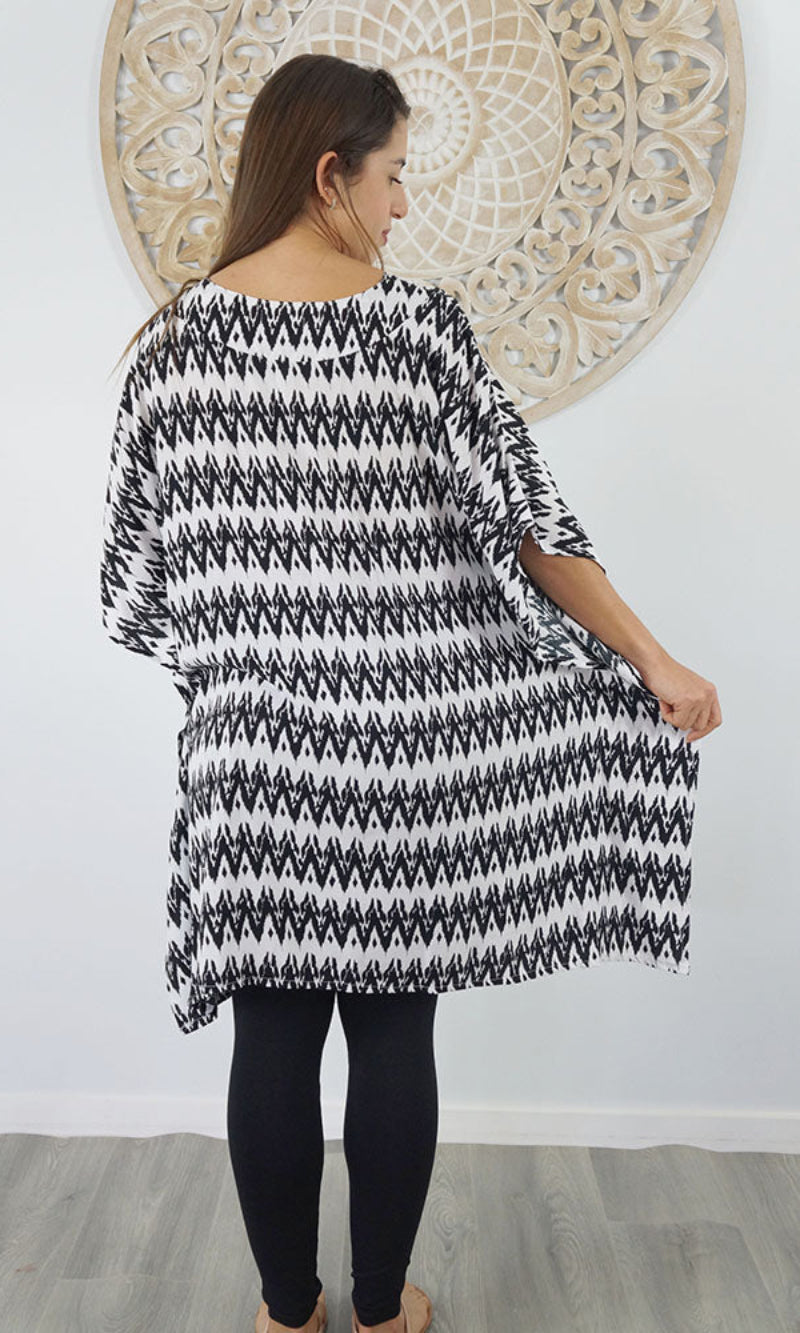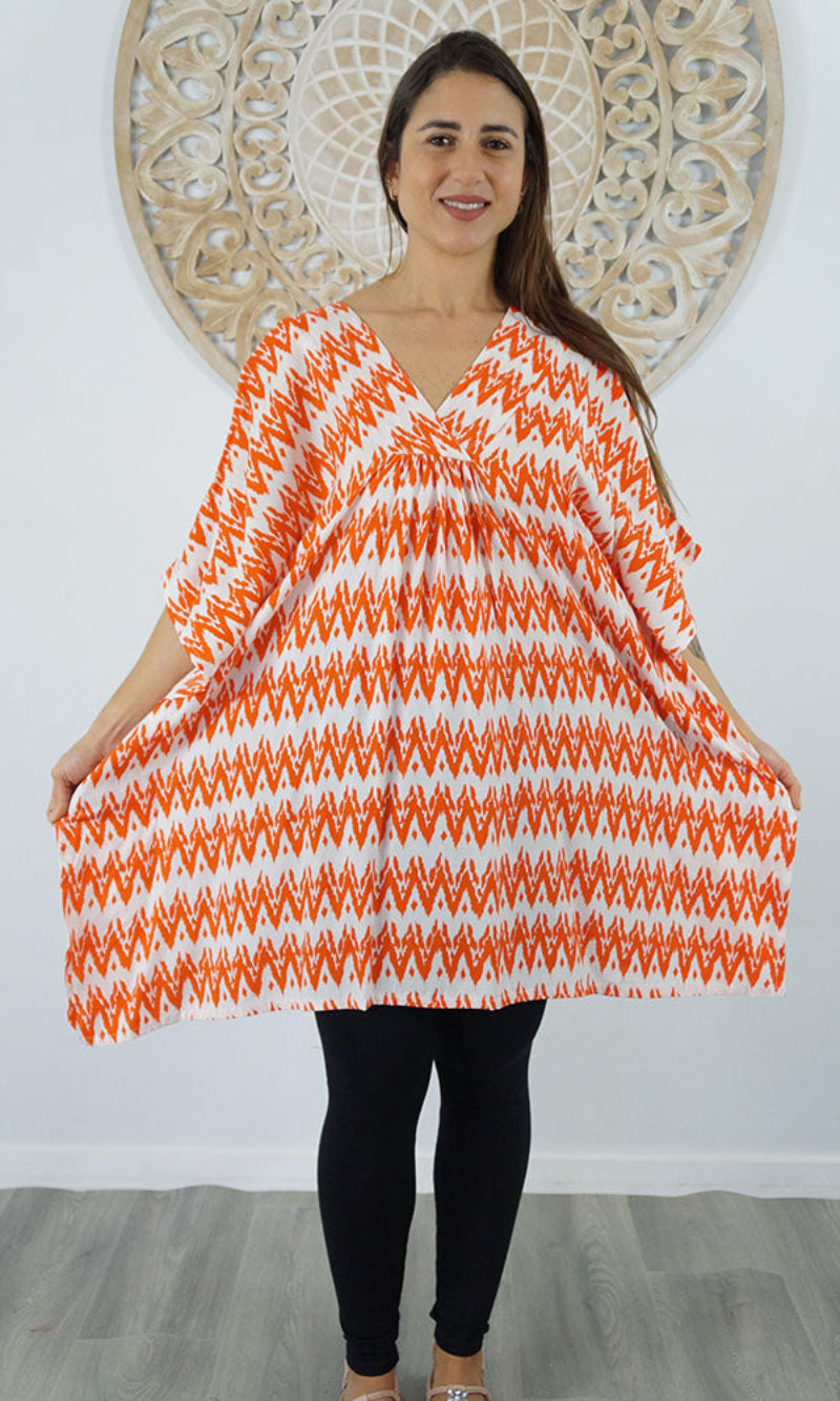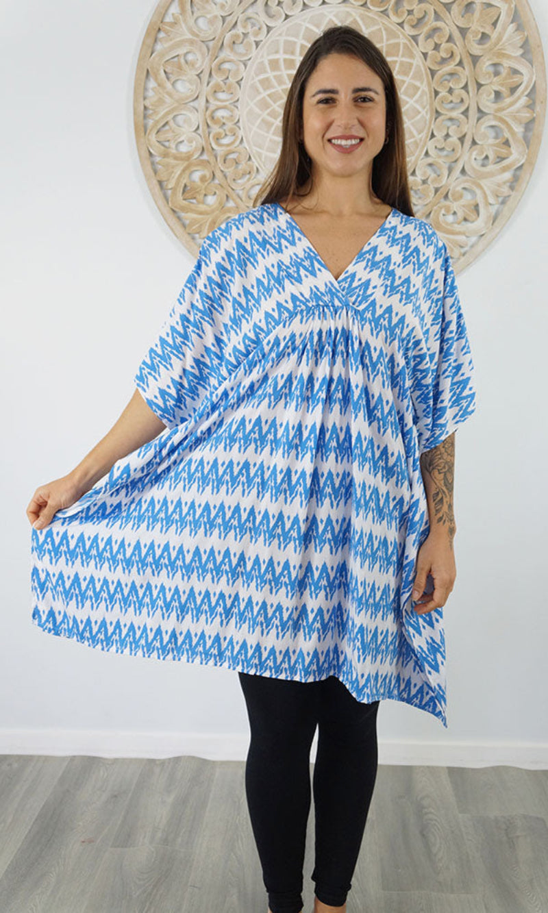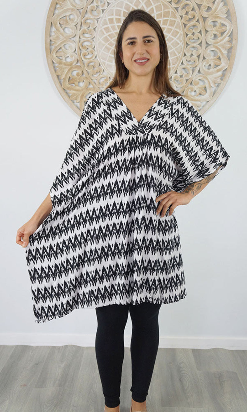 These charming "Classic" Mumus with a ZigZag pattern offer a cozy option for lounging by the pool or beach. They measure around 85cm in length and fit sizes 10 to 20 comfortably. Crafted from 100% breathable Rayon for all-day ease.