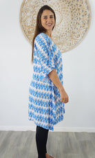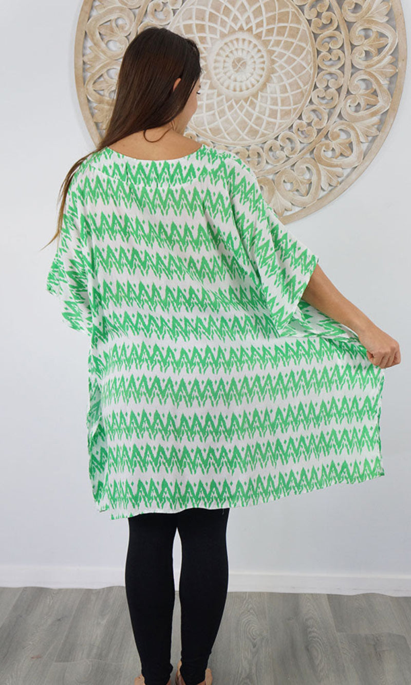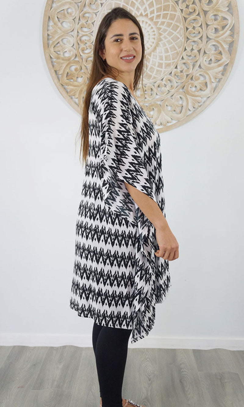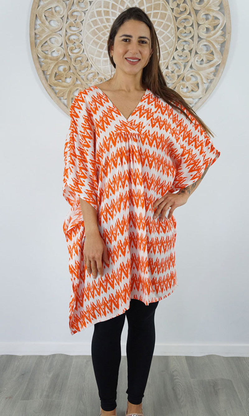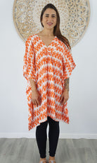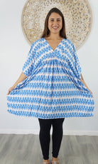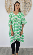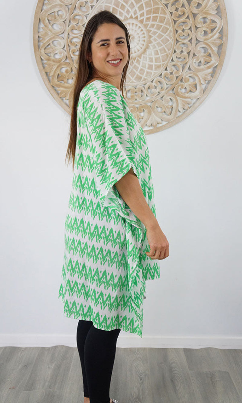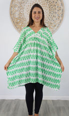 These charming "Classic" Mumus with a ZigZag pattern offer a cozy option for lounging by the pool or beach. They measure around 85cm in length and fit sizes 10 to 20 comfortably. Crafted from 100% breathable Rayon for all-day ease.