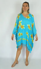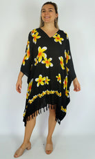 This light rayon kaftan makes a wonderful gift. One size fits size 10 to 26 comfortably. It has tassels at the bottom and is approximently 85cm in length.