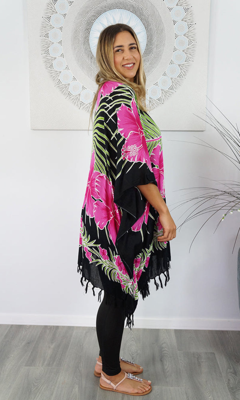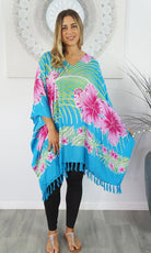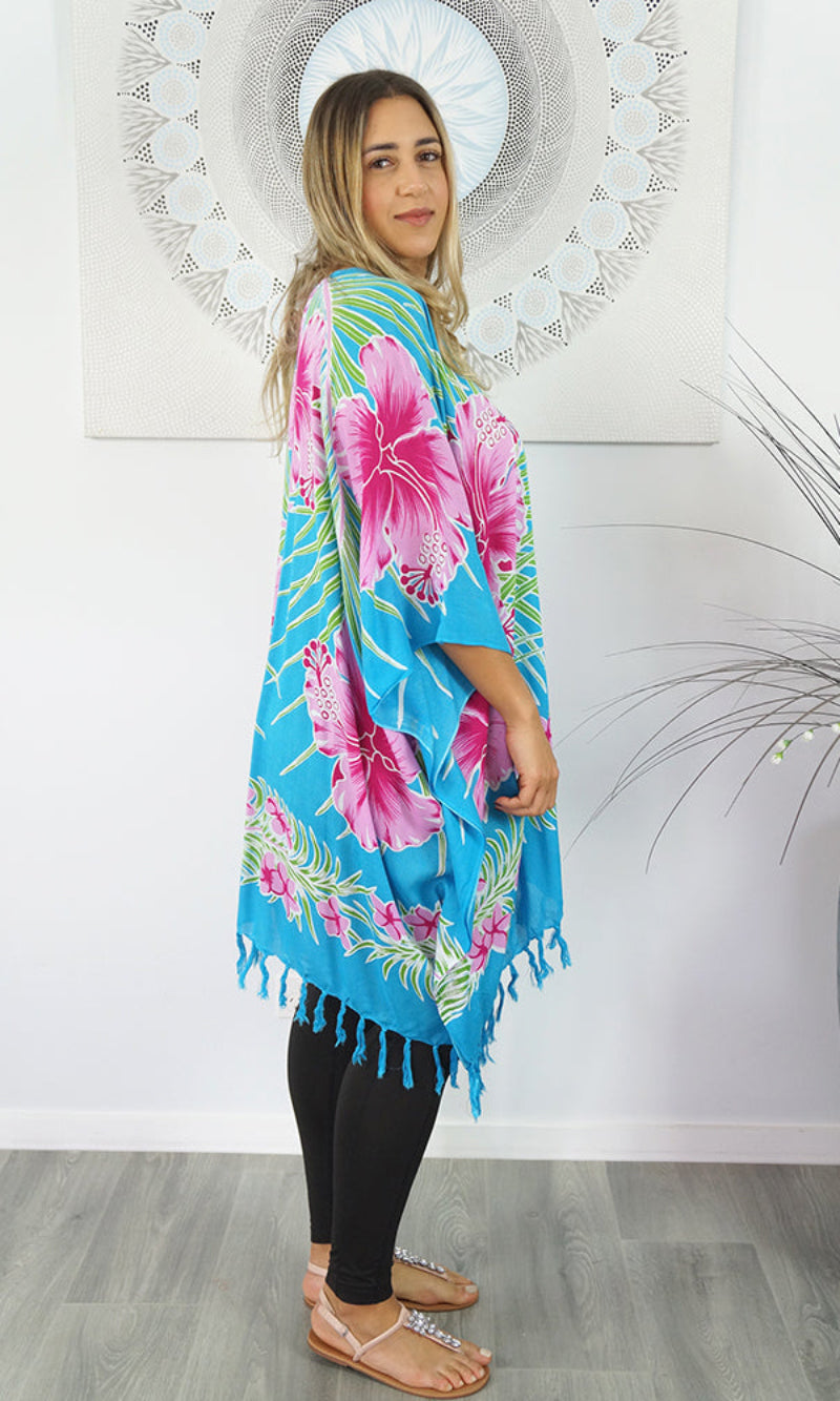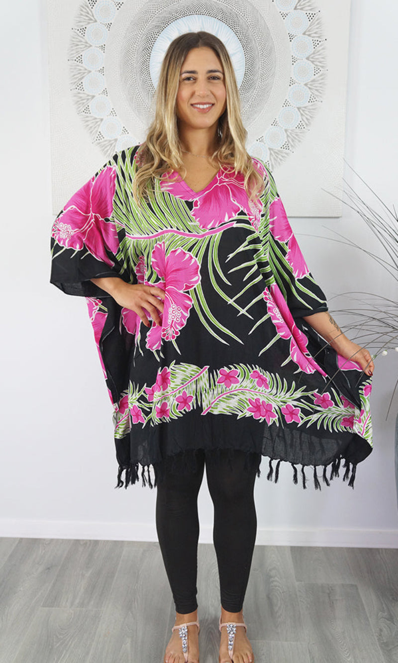 A comfortable way of relaxing around the pool or on the beach, this all rayon Floral print cover up suitable for sizes 10 to 26. Finished length is approximately 85cm