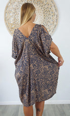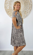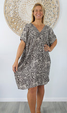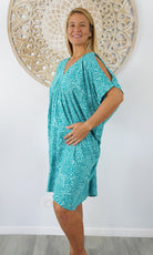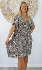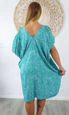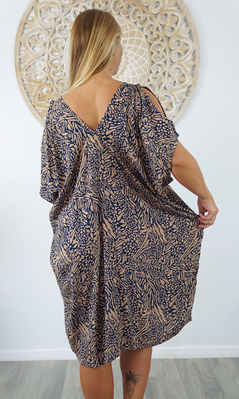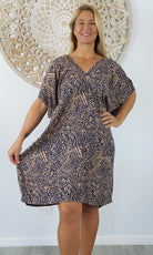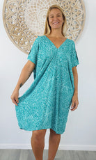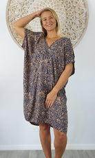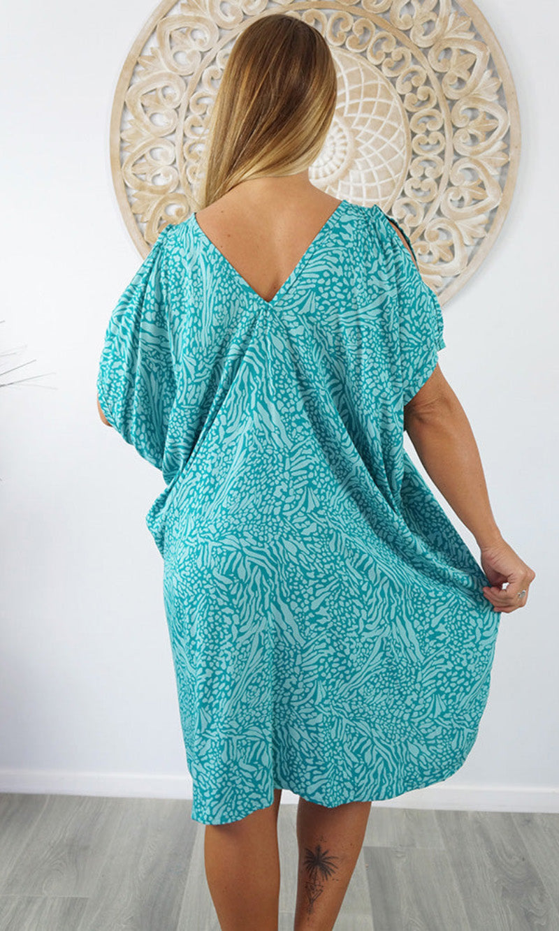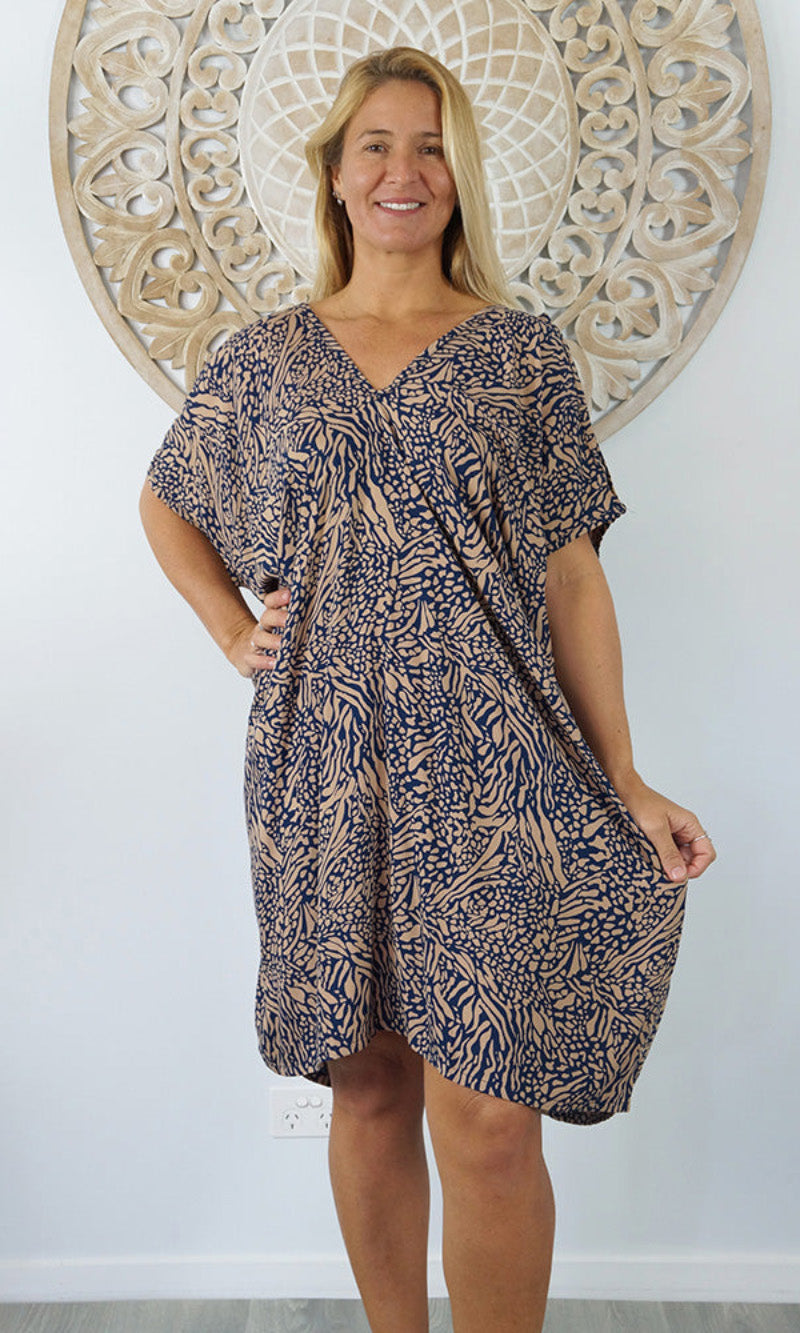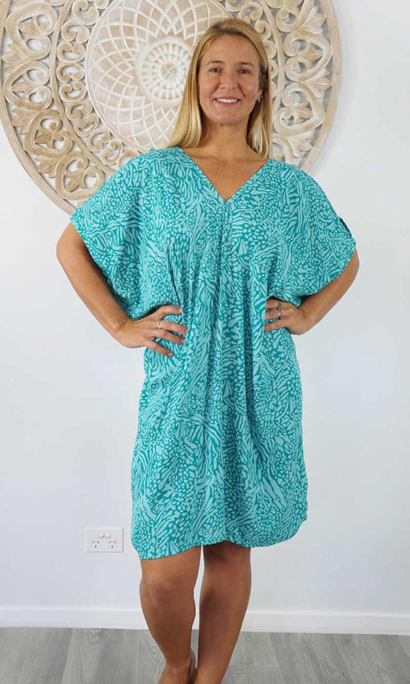 A simple and comfortable dress or tunic for those warm summer days. This rayon garment features a v-neck line, front and back, cut out elbow length sleeves with a button that can be optional to wear undone.