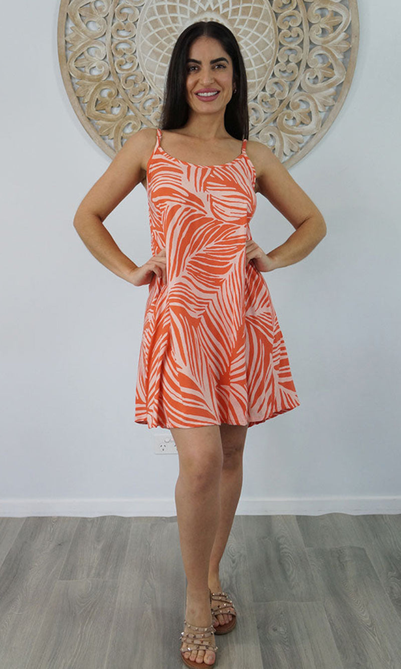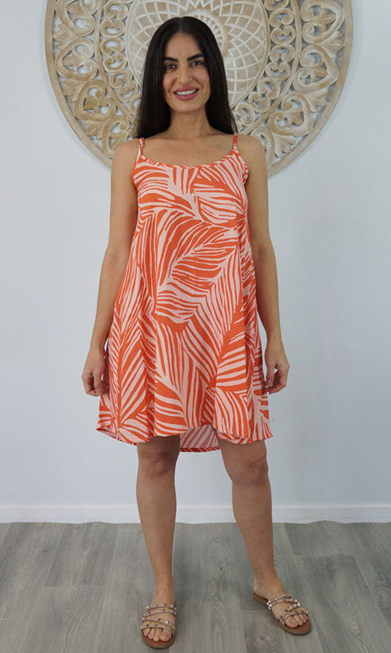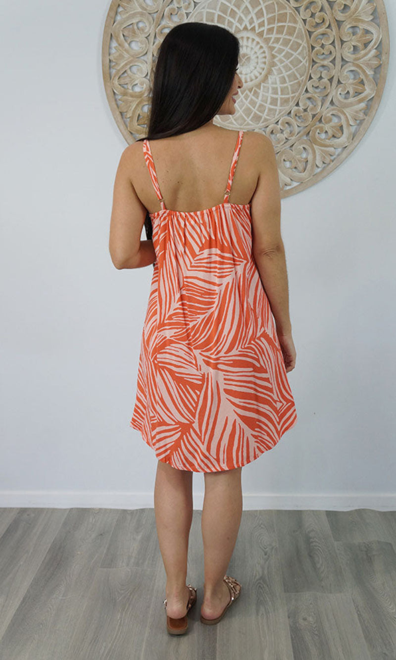 This is a lightweight mini dress that features thin adjustable straps with elastic on the back.