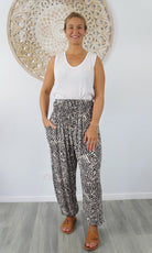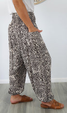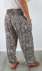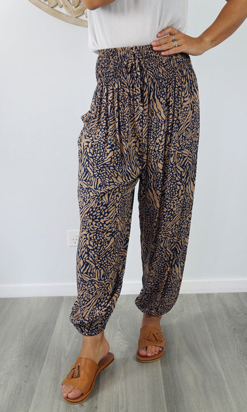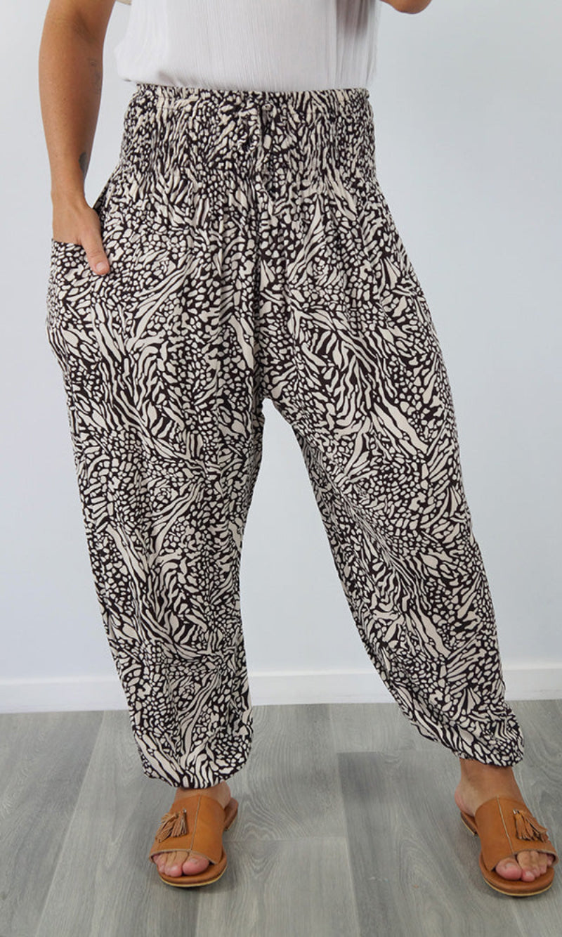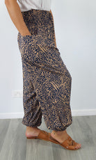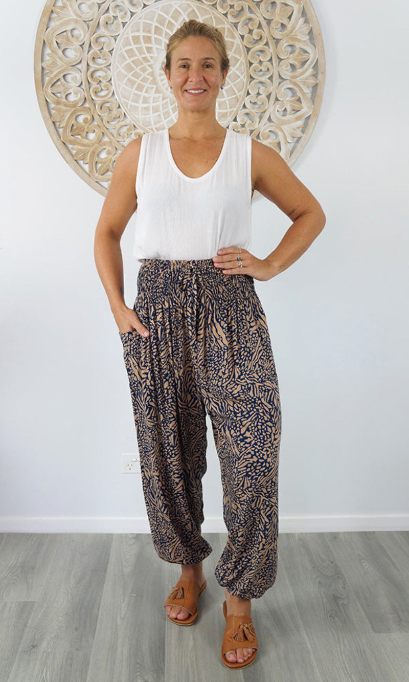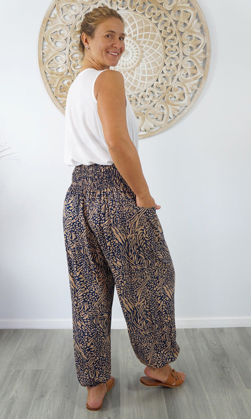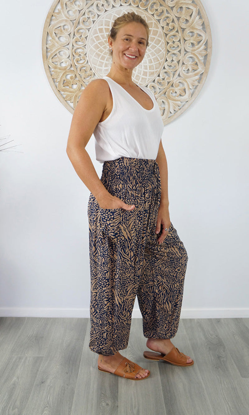 The harem pant is 100% rayon and 100% comfort, with shirring around the waist and elastic around the ankle. 3 sizes available. Free size to fit 10-16, 18-20 and 22-24.