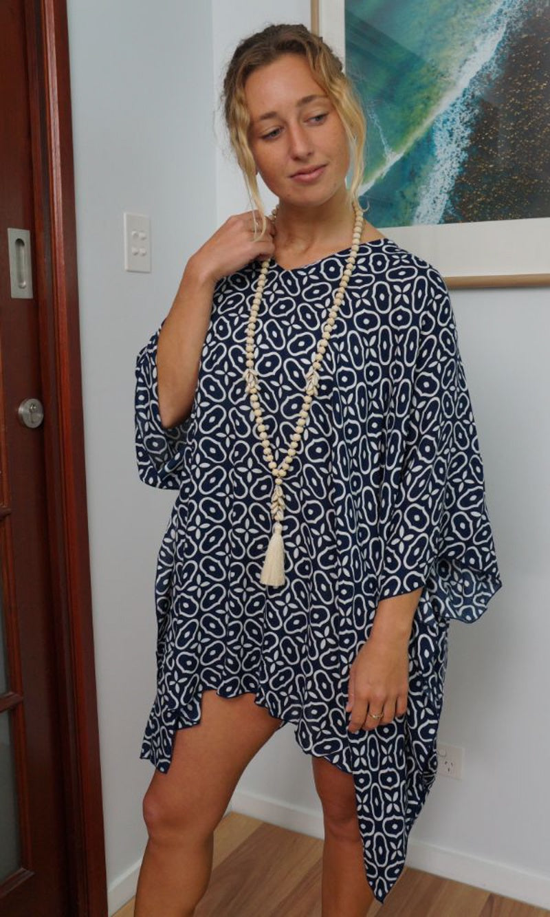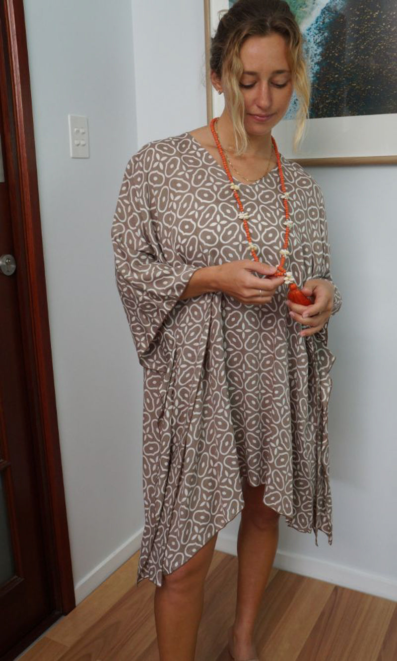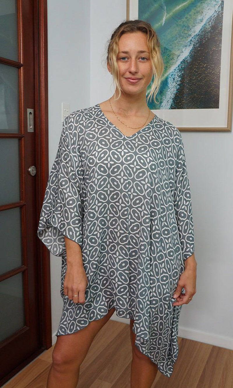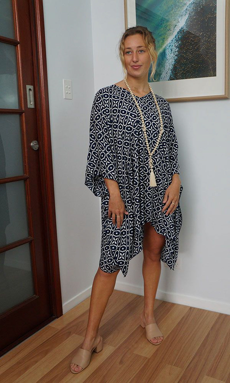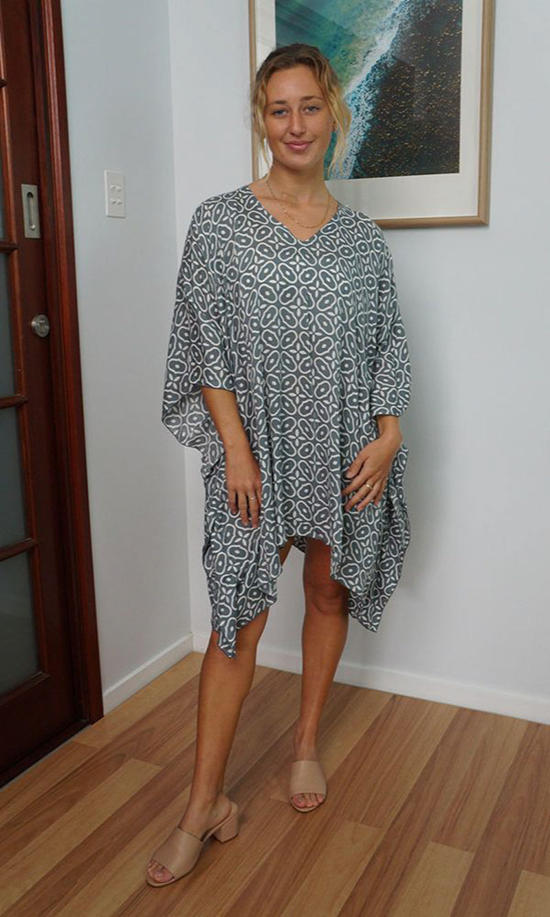 Can be worn over the swimmers as a kaftan, or over pants as a top. Free and flowing comfortable.