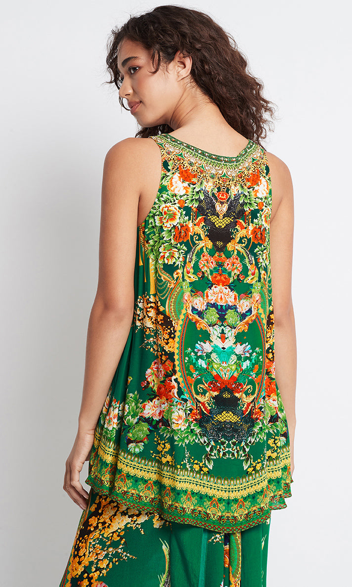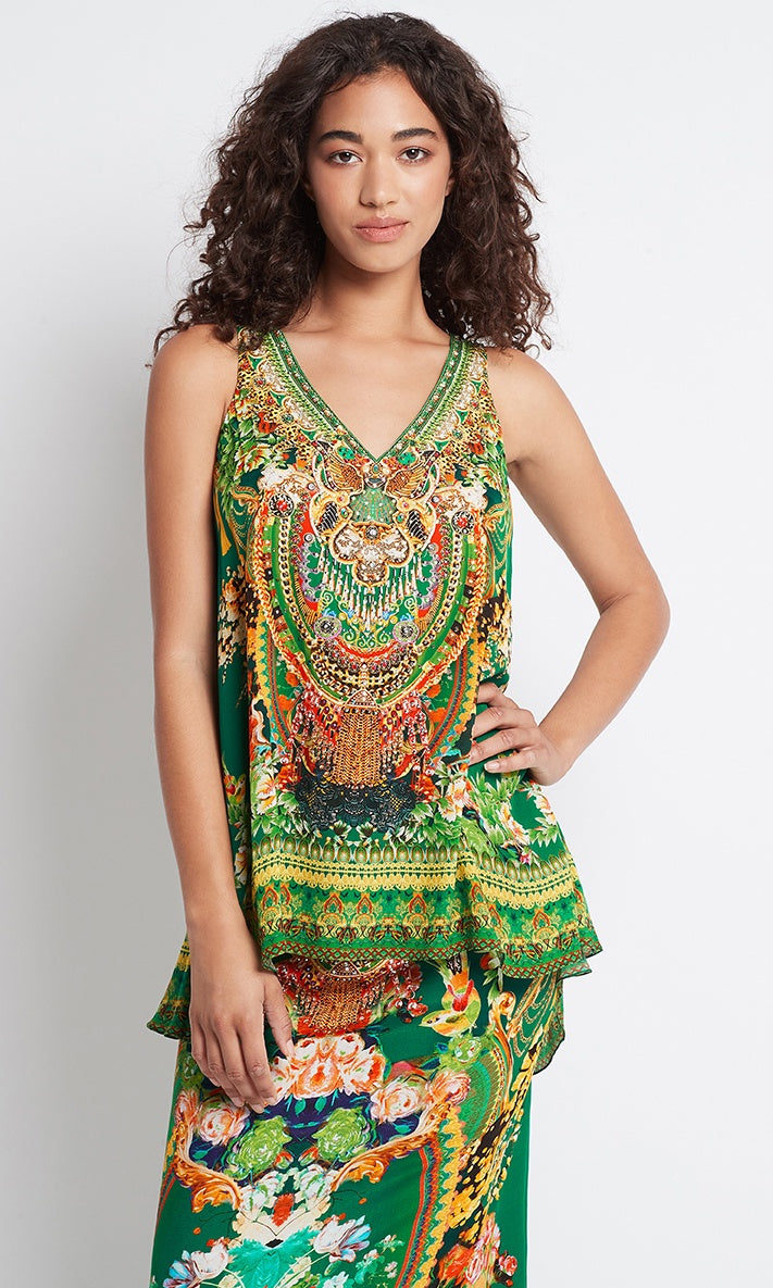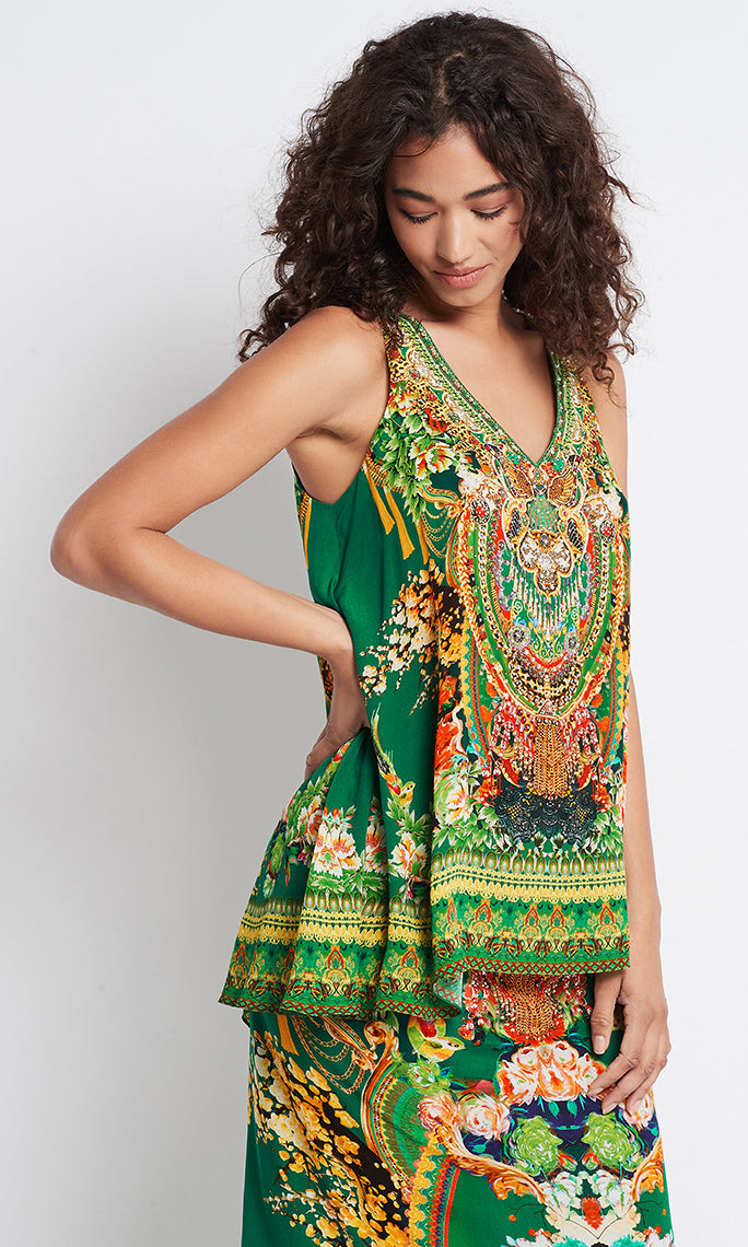 For an easy-to-wear polished look, team this chic tank top with your favourite skirt or denims or dress pants. Designed with hand-applied crystal embellishments, featuring a flattering v-neck with thick straps, and an asymmetrical hemline.