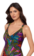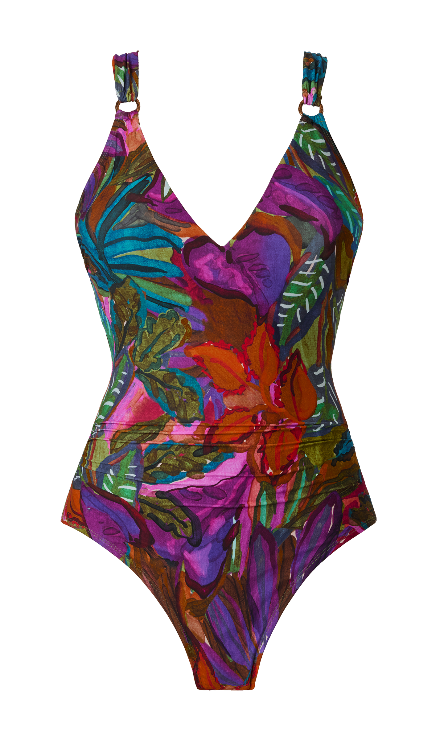 Metal rings highlight the deep V-neckline of this adjustable back swimsuit, with wide straps that transition into a customizable racerback design.