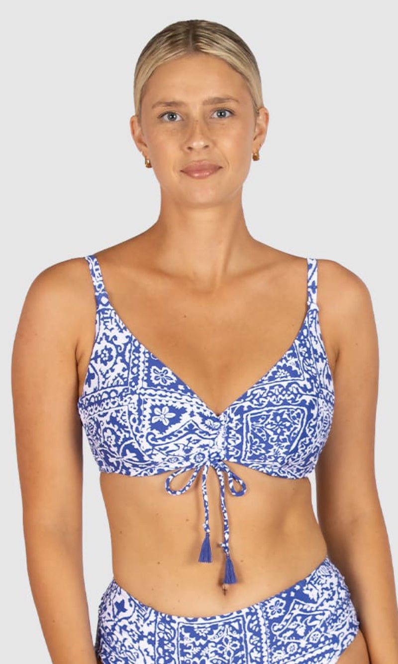 Experience elevated comfort and style in the Havana D/E Underwire Top, featuring a discreet hidden underwire, flattering ruched front detail, clip back for security, side boning for added support, and Lycra cup support for a tailored fit.