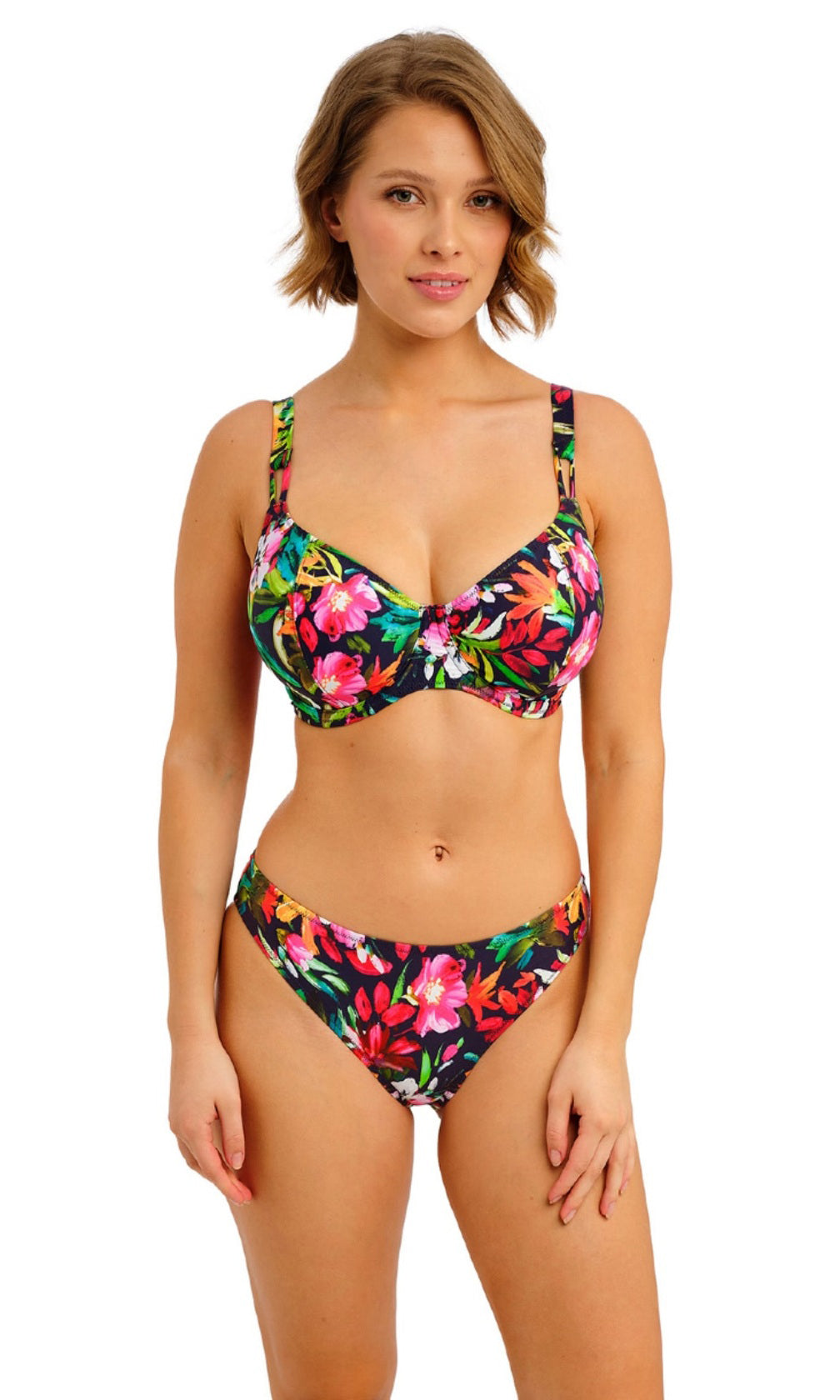 Hit the waves in style with Kailua Shores, our new hot tropical print, designed to make a bold statement. Fusing this season’s key colours of hot pinks, fiery oranges, and luscious jades across a dark navy ground, select styles are accented with gold coloured leaf trims. Kailua Shores is the perfect collection for lounging by the pool or hitting the beach, especially in our new reduced coverage UW Plunge Bikini Top - perfect for tanning!