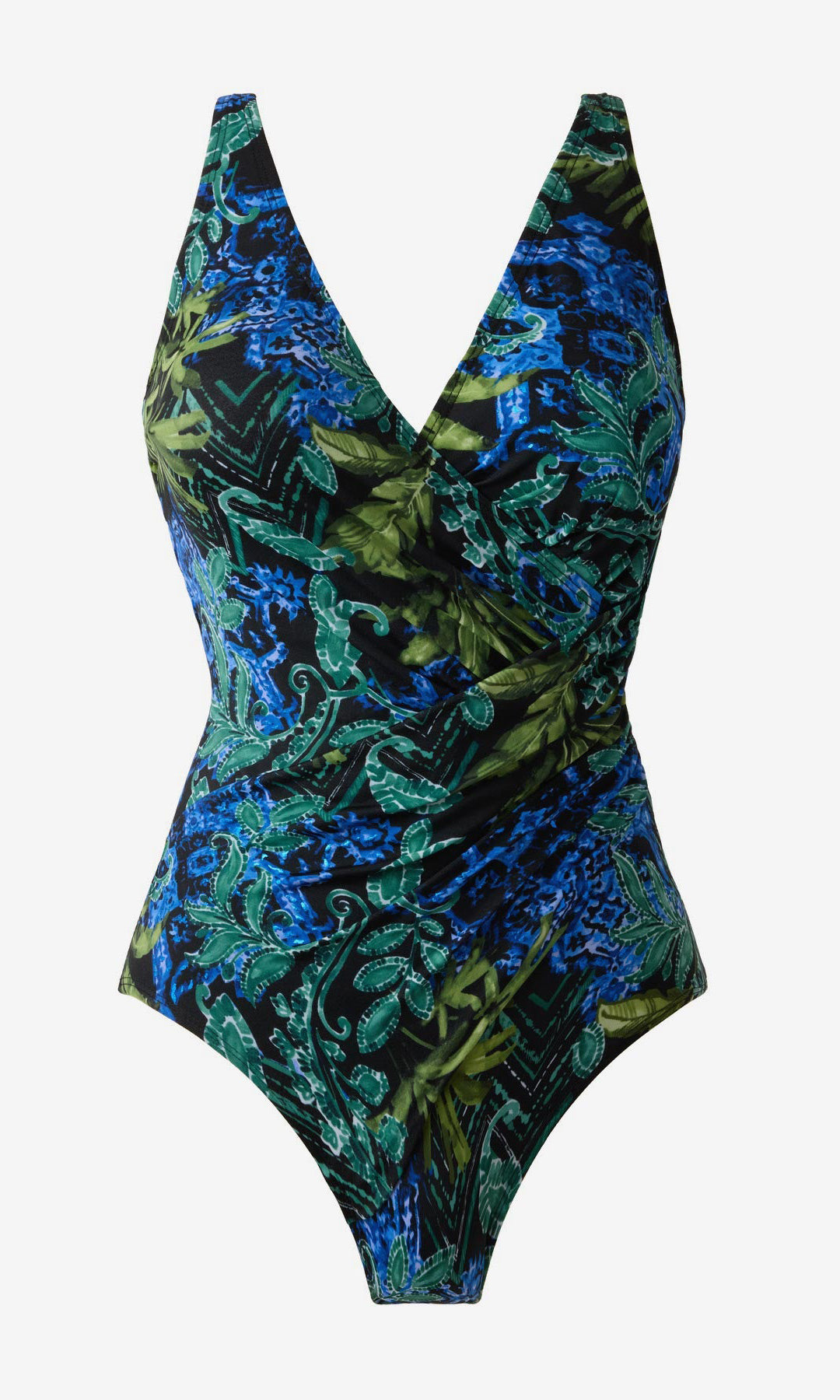 Draping through the front shapes the waistline, while soft cups and adjustable straps add lift and support.