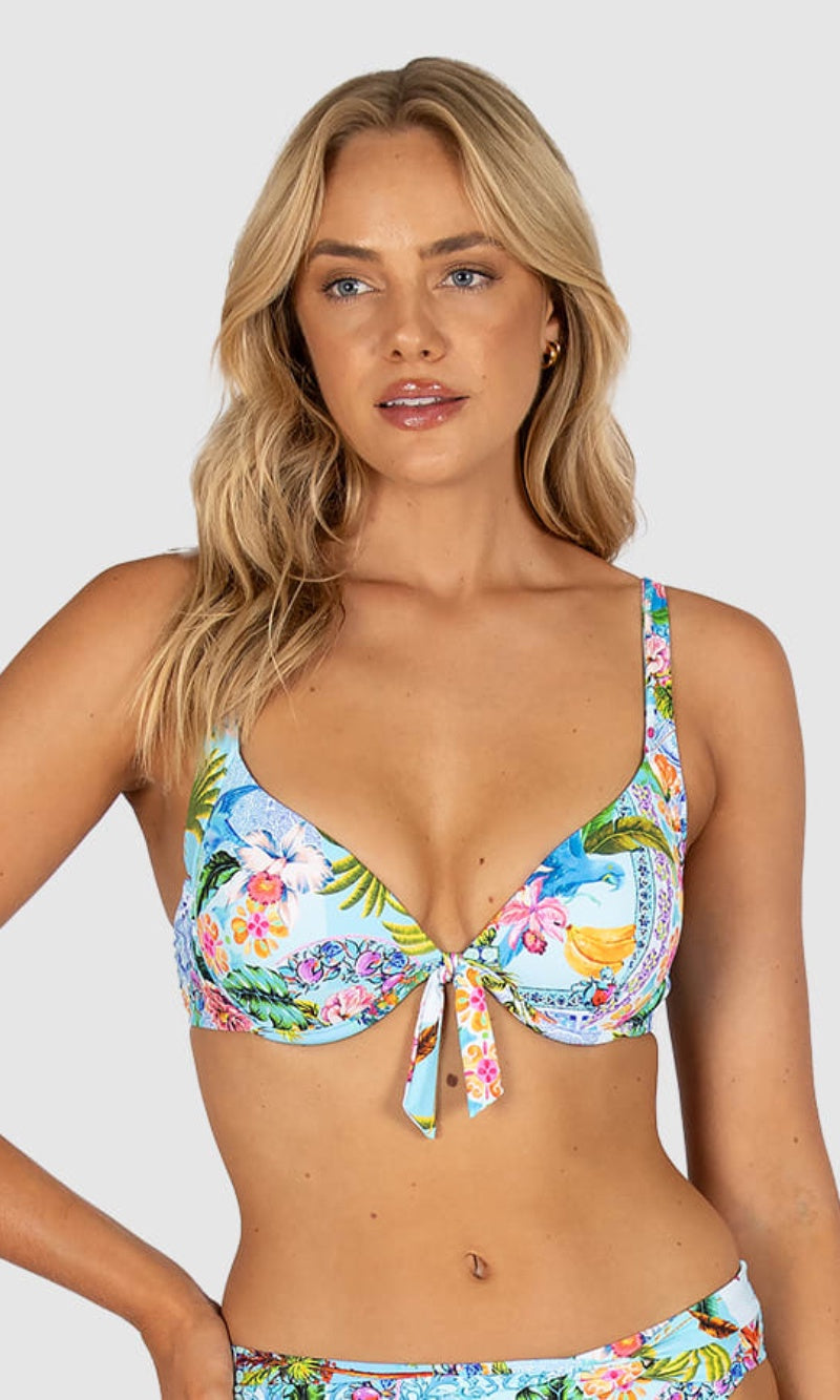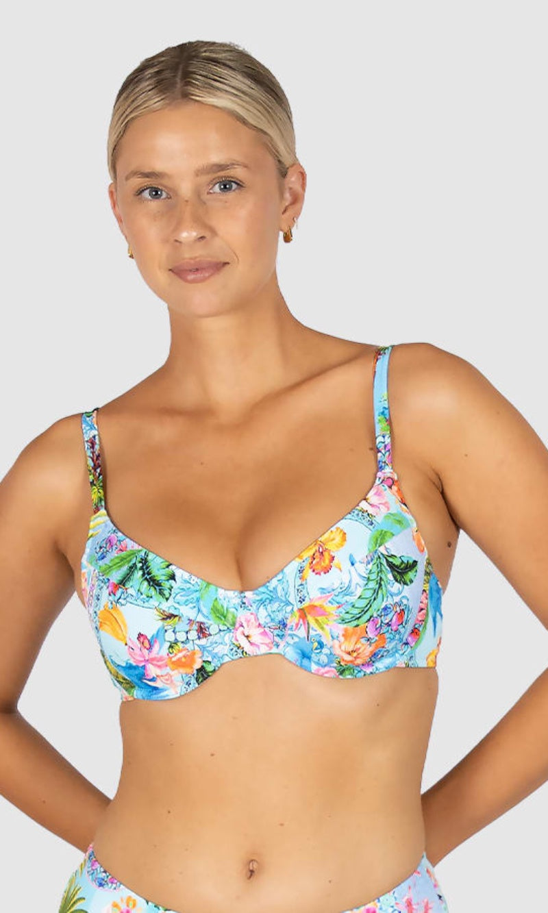 The Sardinia Dream Support Booster Bikini Bra Top features moulded underwire cups, removable booster pads, adjustable and convertible straps, and clip-back soft side panels for added coverage and support.