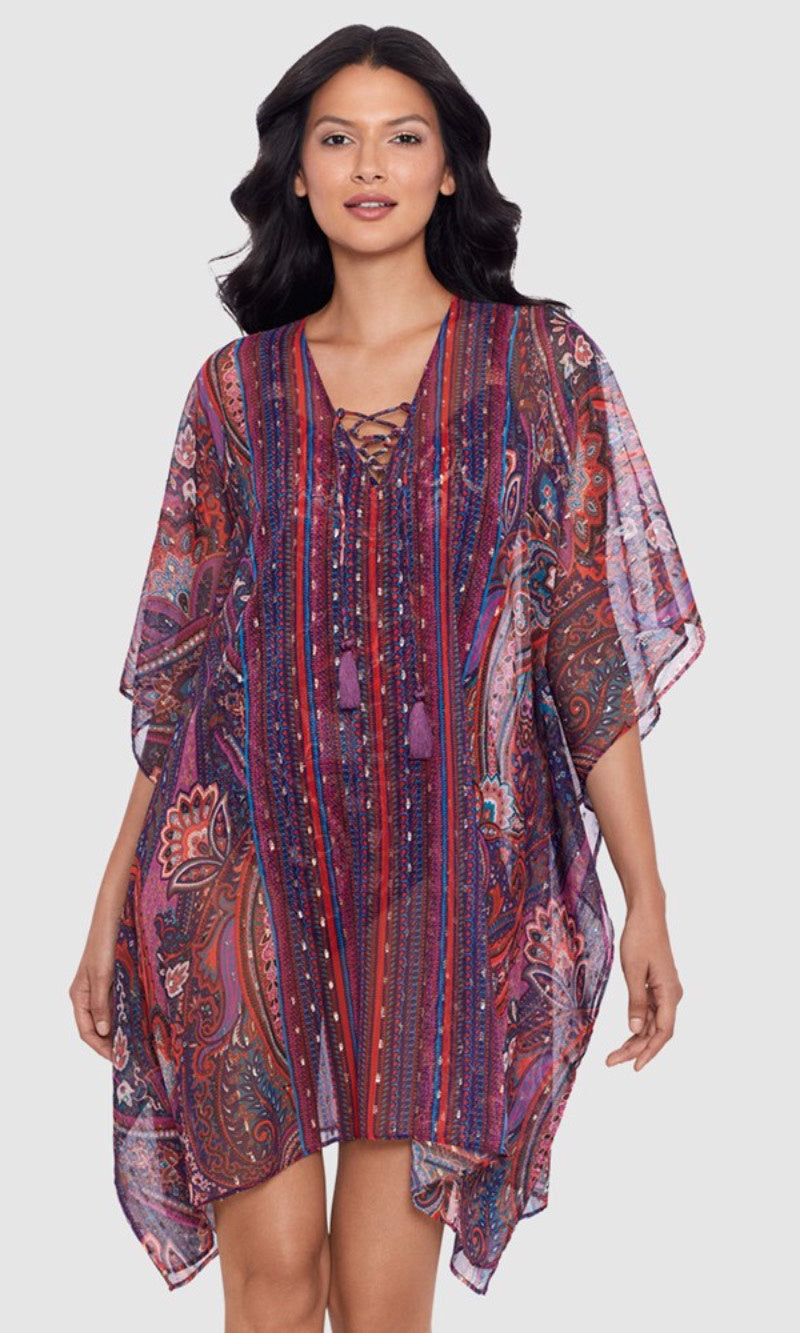 Take your beach or poolside look to the next level with this elegant chiffon beach coverup featuring shimmery metallic dots and a stylish, lace-up neckline with tassels. Lightweight and floaty, it's the perfect swim cover up for hot summer days - wear it with the matching swimsuit for maximum visual impact.