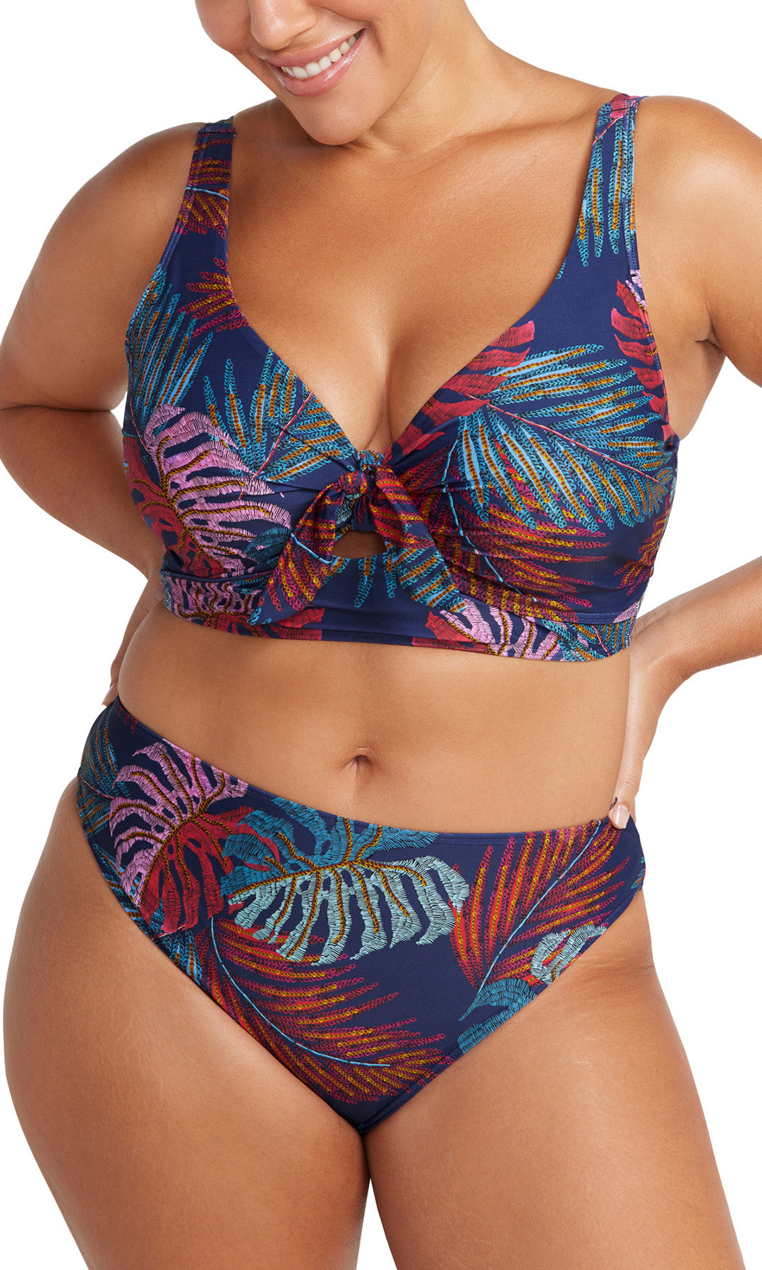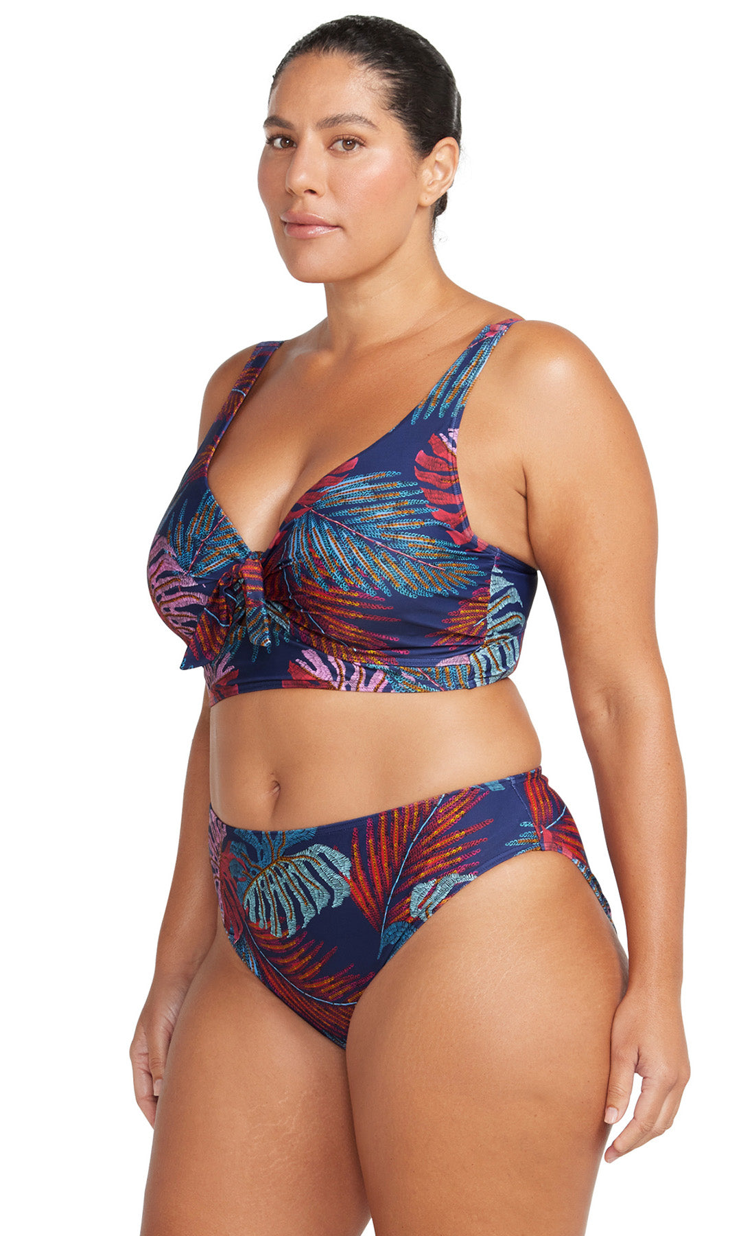 Artesands fits your curves. Make a curve statement in our Artesands Cezanne plus size midriff bikini top, the most flattering swimsuit shape EVER. Our Cezanne bikini top shape has a mock knot tie at the front that covers a full internal cup support system. Our Cezanne shape is an underwire style with full foam cups that create great bust shape for a D cup, DD cup to E cup. But it is the peep hole on this style that creates the most amazing figure flattering illusion. The peephole creates a body enhancing hourglass shape and when paired back with our curve fit and plus size swim pants.