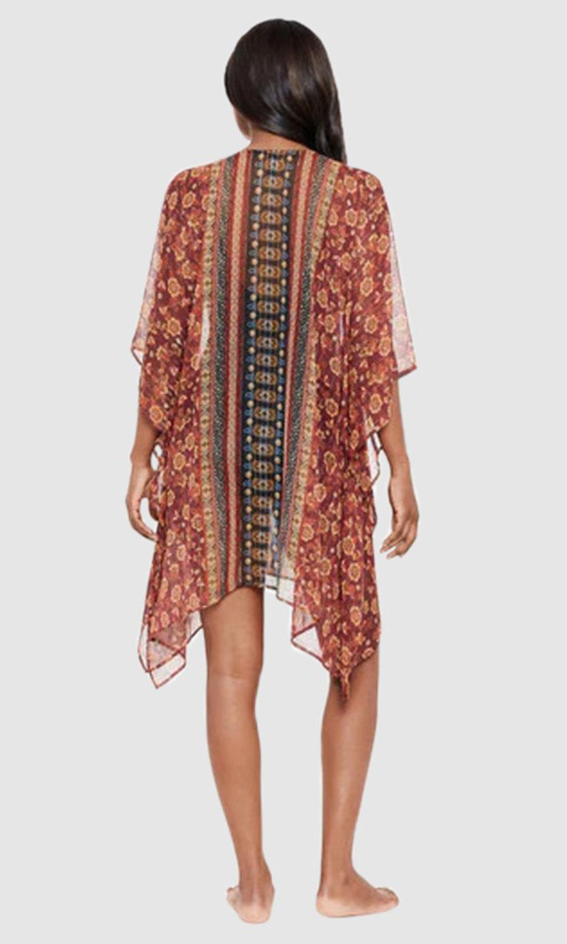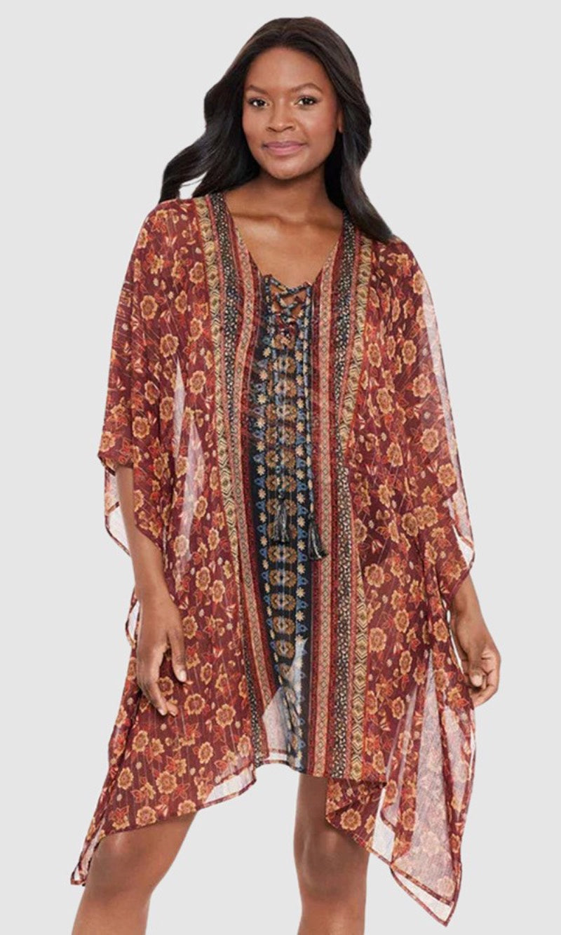 Perfect for pool parties, resorts, or just looking fabulous at the beach, this swim cover up is as comfortable as it is chic thanks to the easy, breezy one-sized fit. A touch of gold shimmer and the lace-up neckline with long tassel ties both add a luxury vibe to this sheer caftan dress design - wear it with the matching swimsuit for maximum impact.