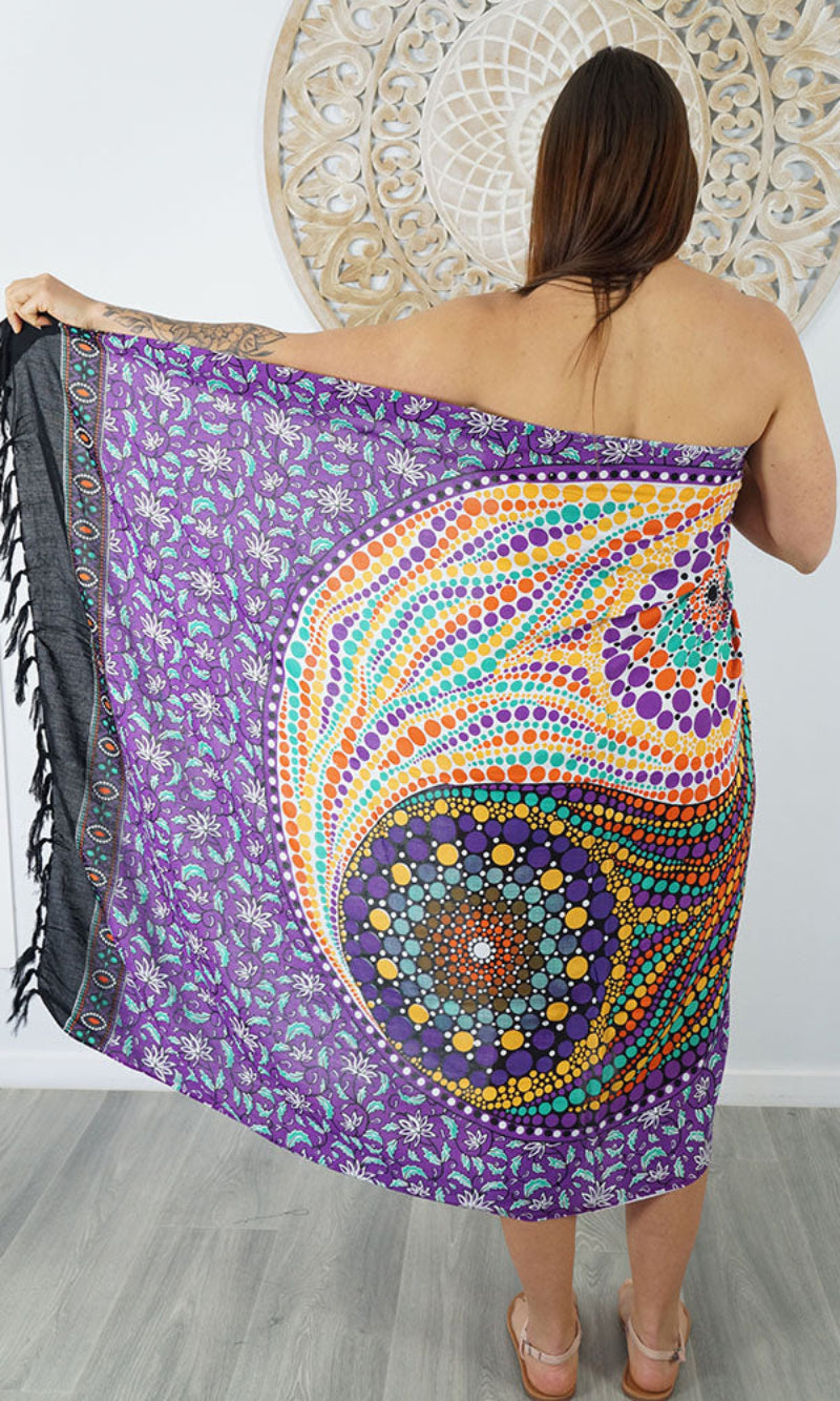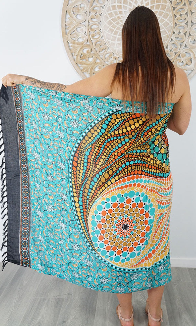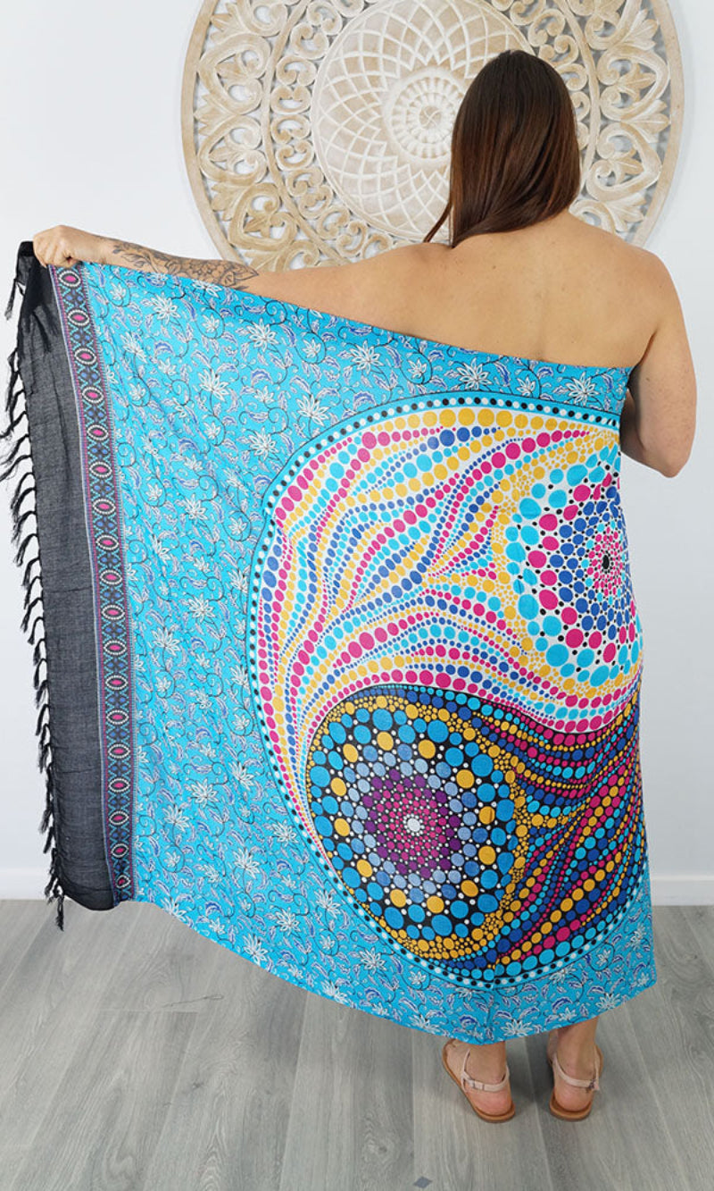 These Tao inspired "Yin YAng" printed sarongs are a great cover up for a day at the beach, pool, lake or wherever else your heart desires. Sarong measures approximately 1.8M x 1.15M on fringed lightweight rayon.