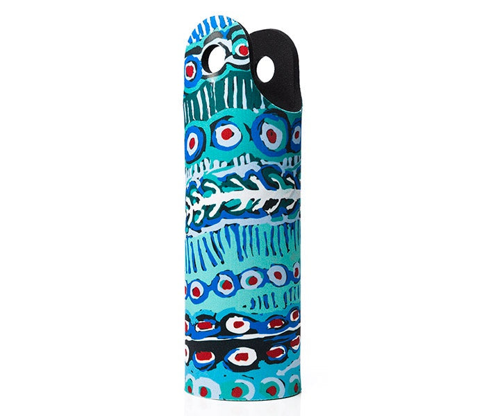 Keep your water bottle close and cool with these great neoprene water bottle carriers. Made in Australia, bottle carriers feature artwork by Murdie Morris from Warlukurlangu Artists in Central Australia. Includes a strap so you can carry on the go!