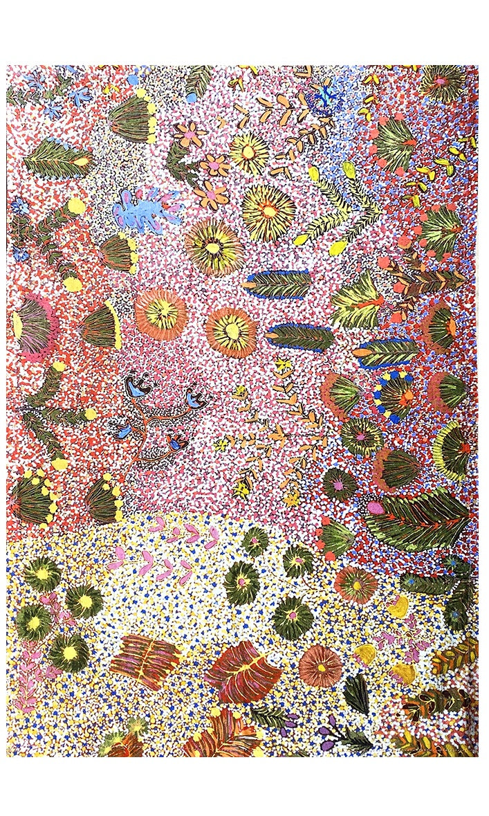 Julienne has painted plants from her country that are used for traditional bush medicine. Artists from Ampilatwatja usually paint landscape and it's content rather than dreaming stories. Their country is connected to their dreaming stories and is cultutally and practically vital to their lives.
