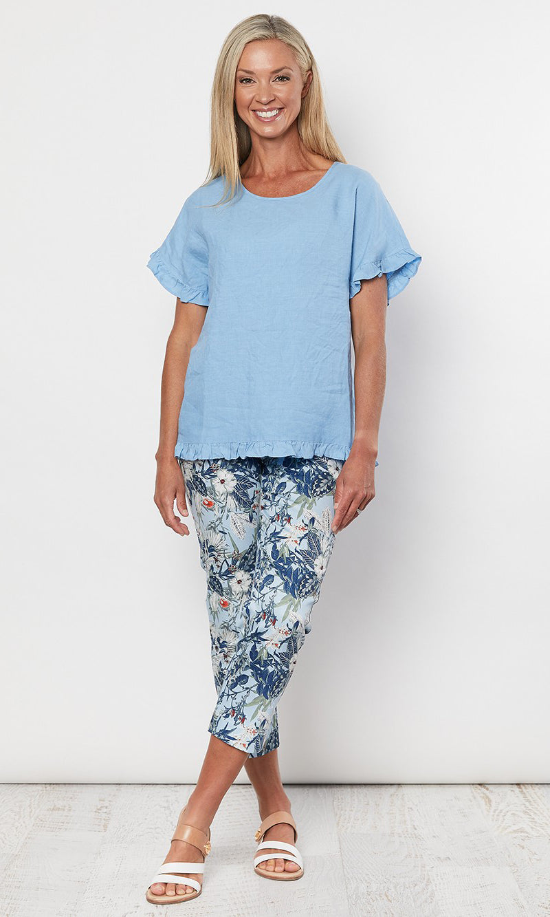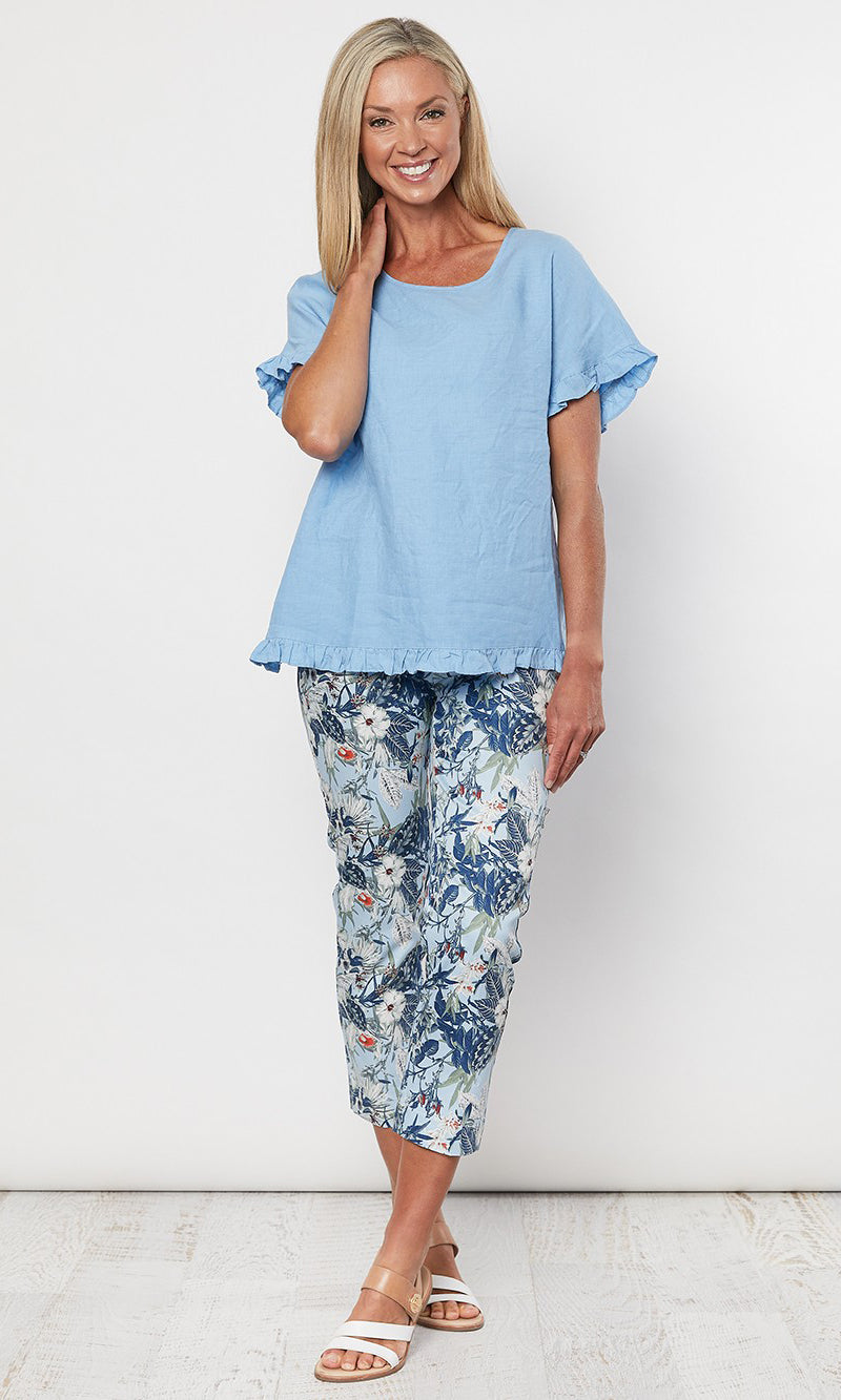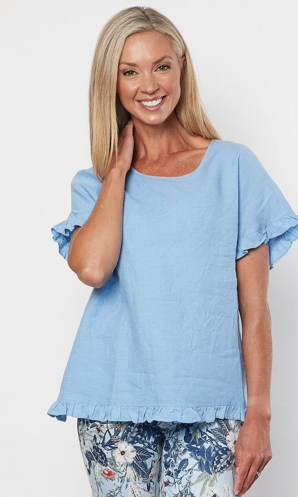 The Julie Frill Trim Linen Top by Gordon Smith is one of our best selling style!