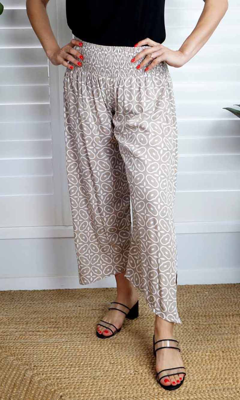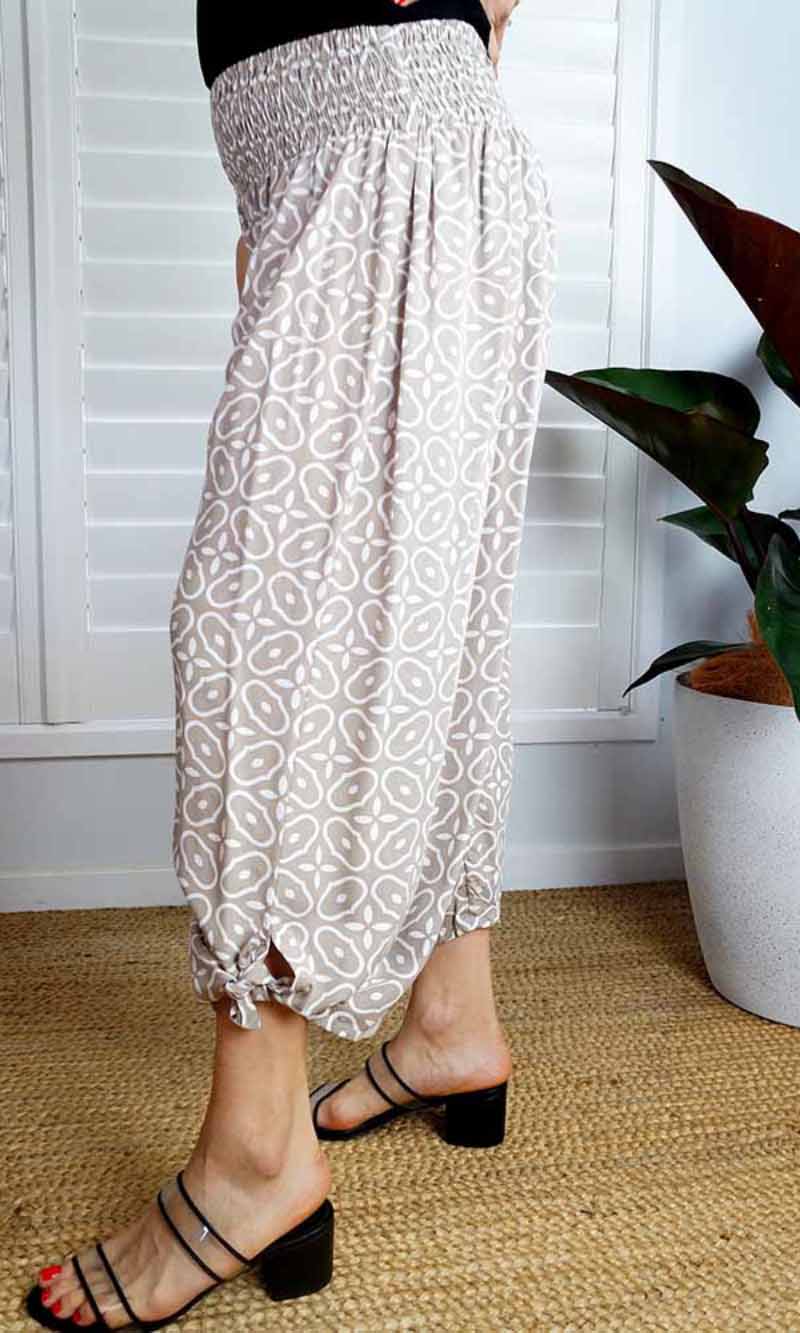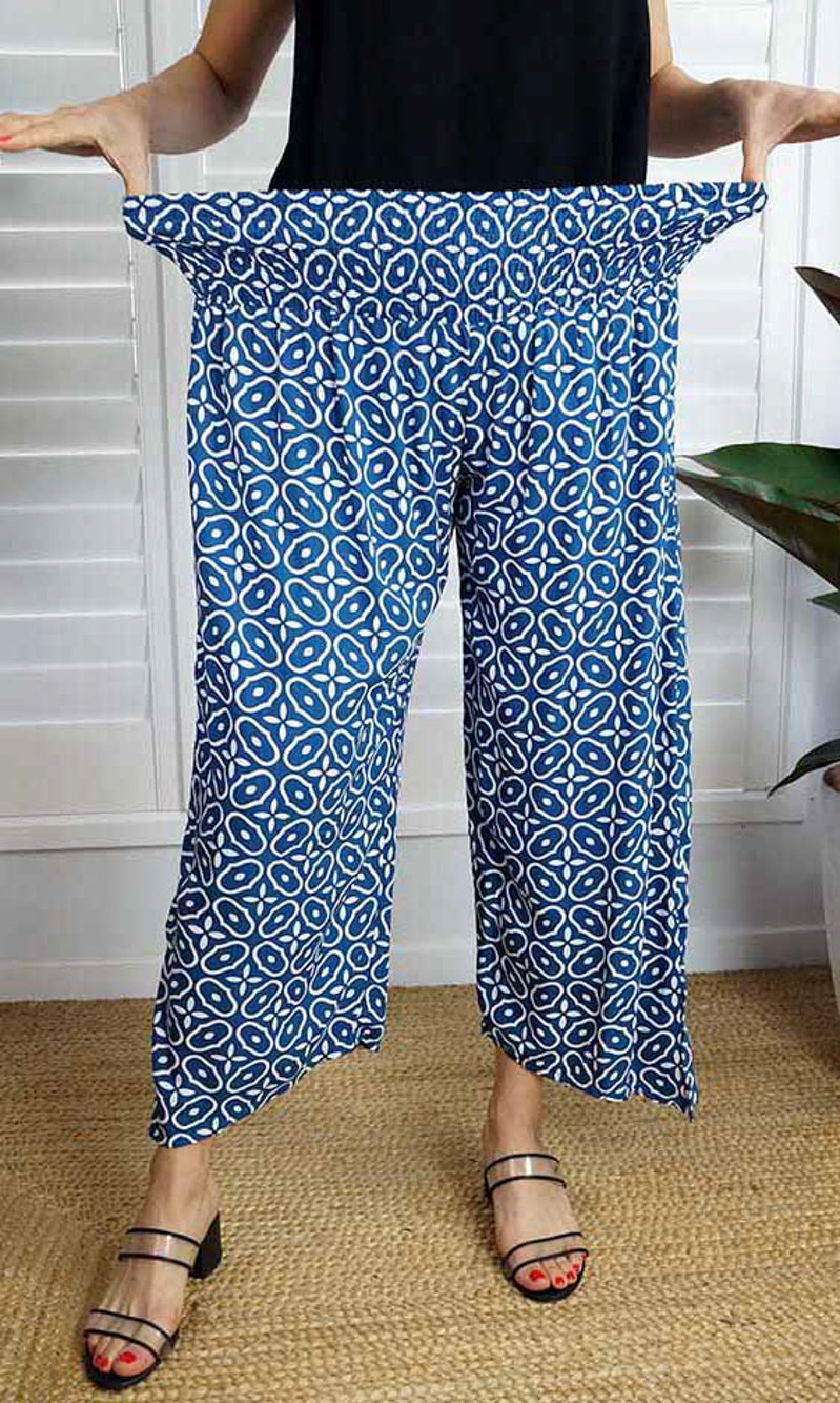 The 3/4 Bazzar pant is a free size garment, fits between size 10-16. This product will give you comfort for an everyday day wear with an elastic waist, wide leg, splits and ties for that classic look. (Can be worn tied or untied at the leg)