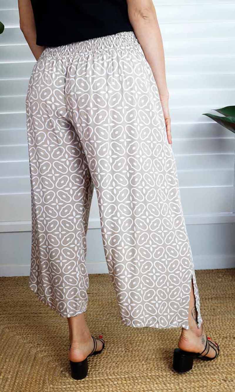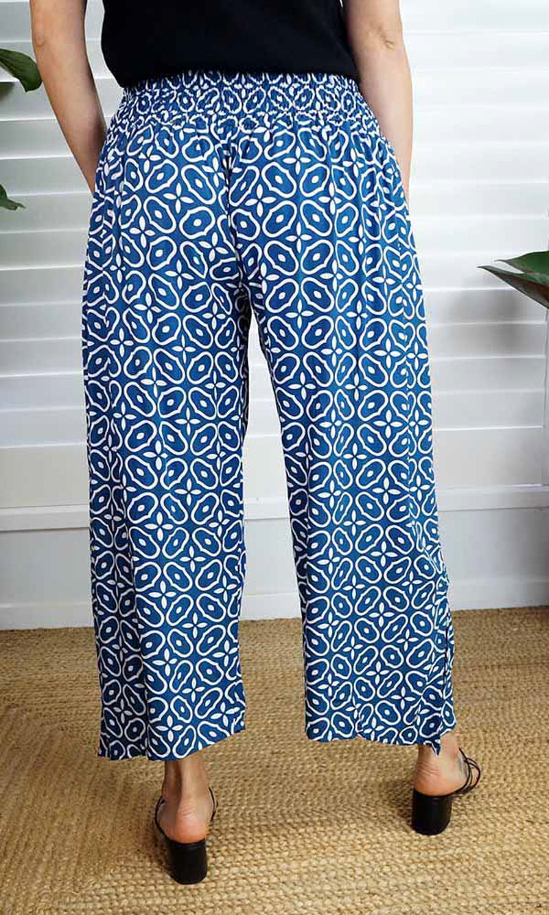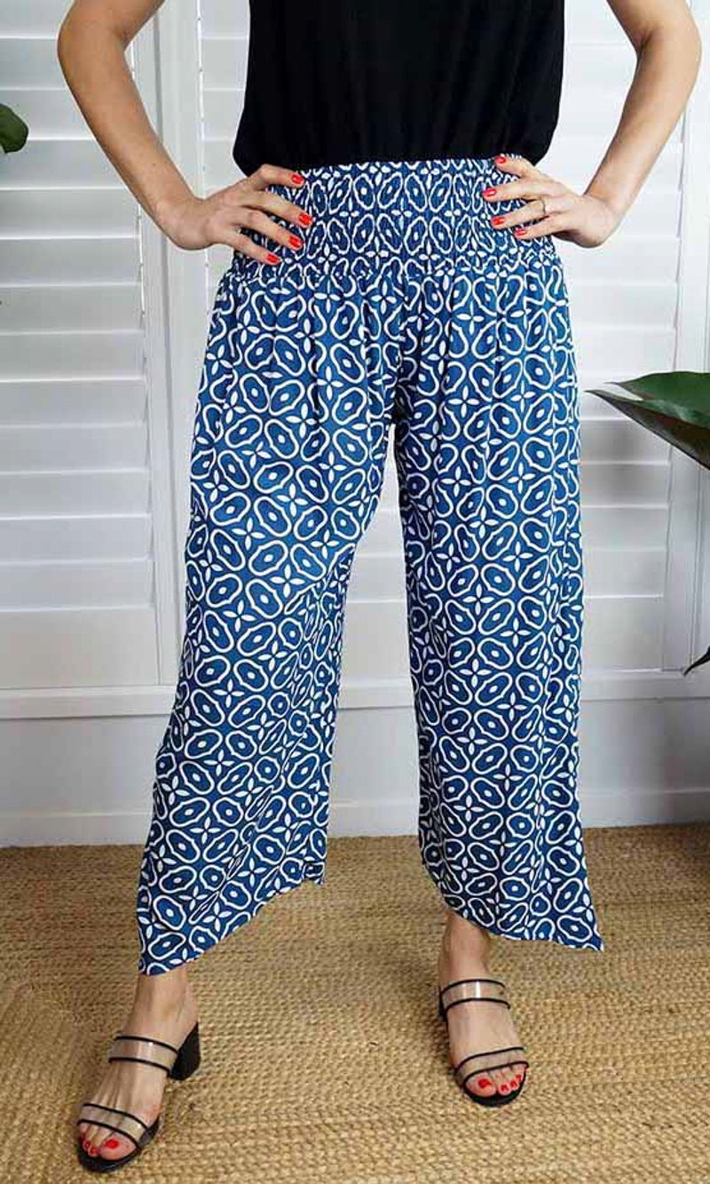 The 3/4 Bazzar pant is a free size garment, fits between size 10-16. This product will give you comfort for an everyday day wear with an elastic waist, wide leg, splits and ties for that classic look. (Can be worn tied or untied at the leg)
