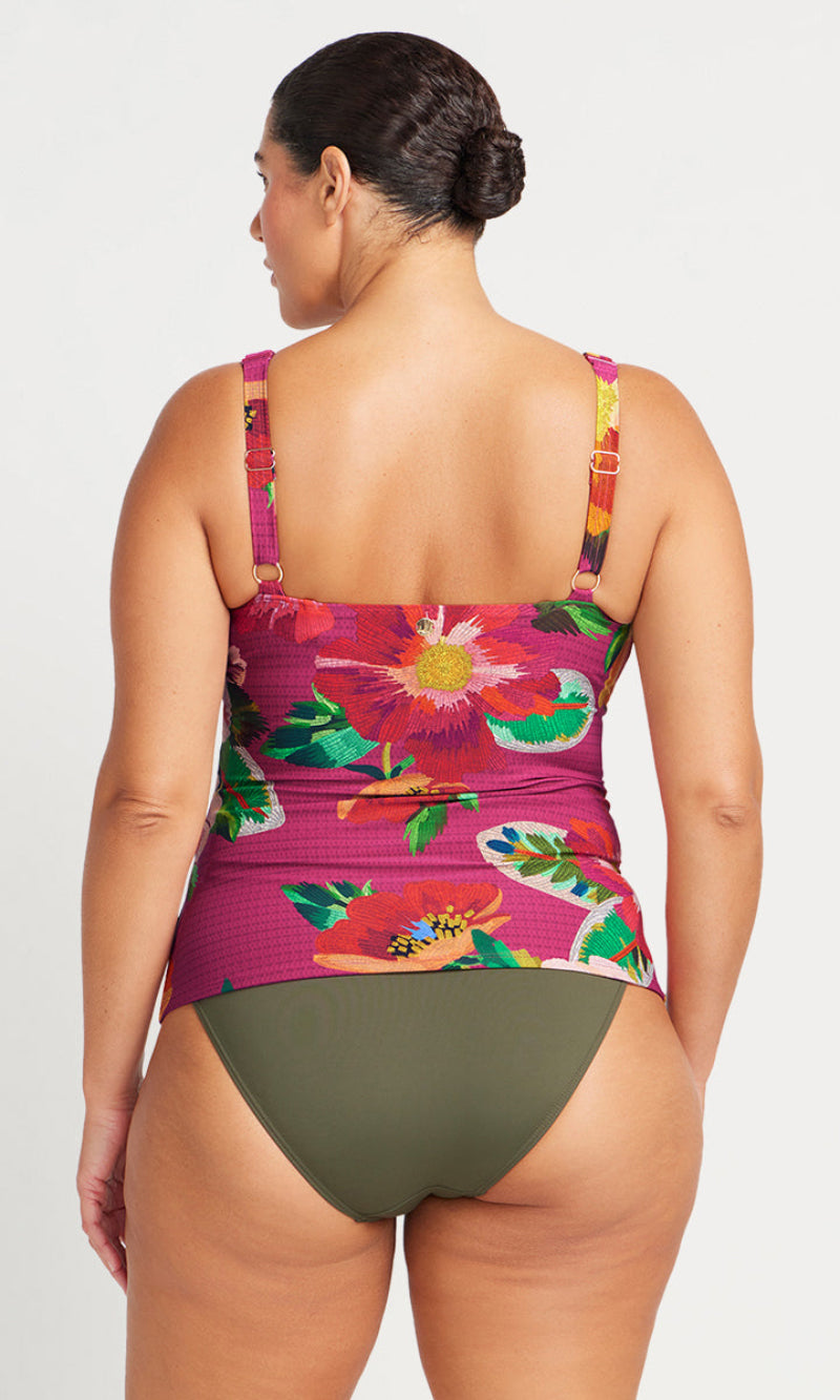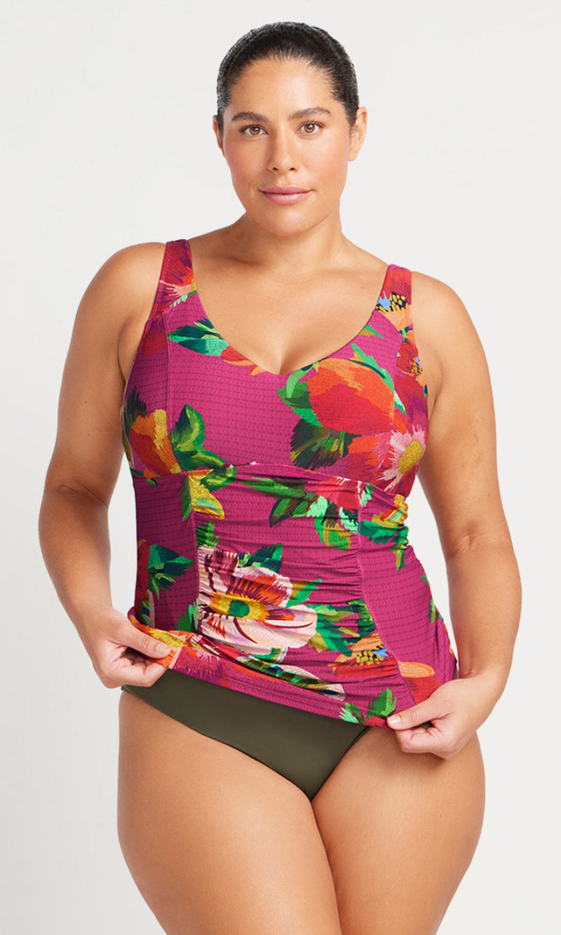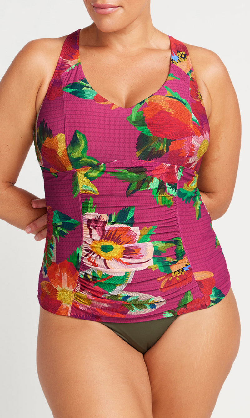 Artesands Fits Your Curves. Raphael is our full support swimsuit style with all the bells and whistles. This curve fit and plus size tankini top has underwire support to fit a E cup to F cup. This swimsuit has an internal bra fitting, and full body 360 degree powermesh for body sculpting confidence. Our curve fit and plus size tankini tops are a long line to avoid the fabric riding up when you're in the water.