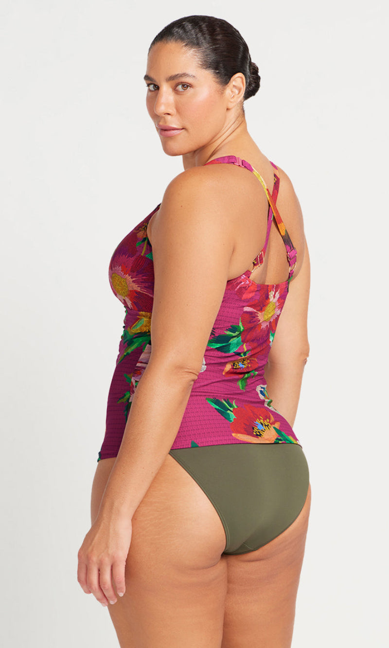 - Long line tankini top - Our curve fit and plus size tankini top is designed to be fitted to the body. This features a long line length to avoid any riding up while swimming or lounging around the pool. Designed to look like you are wearing a one piece when paired back with the matching swim pant.