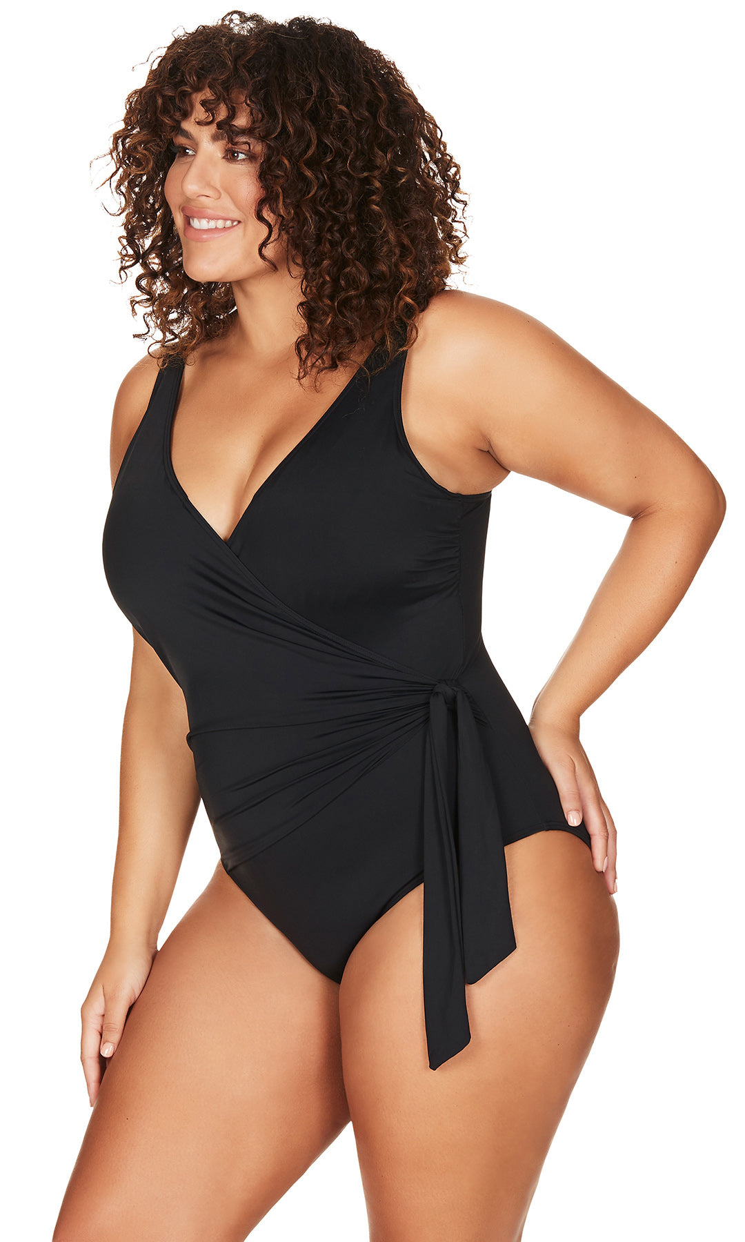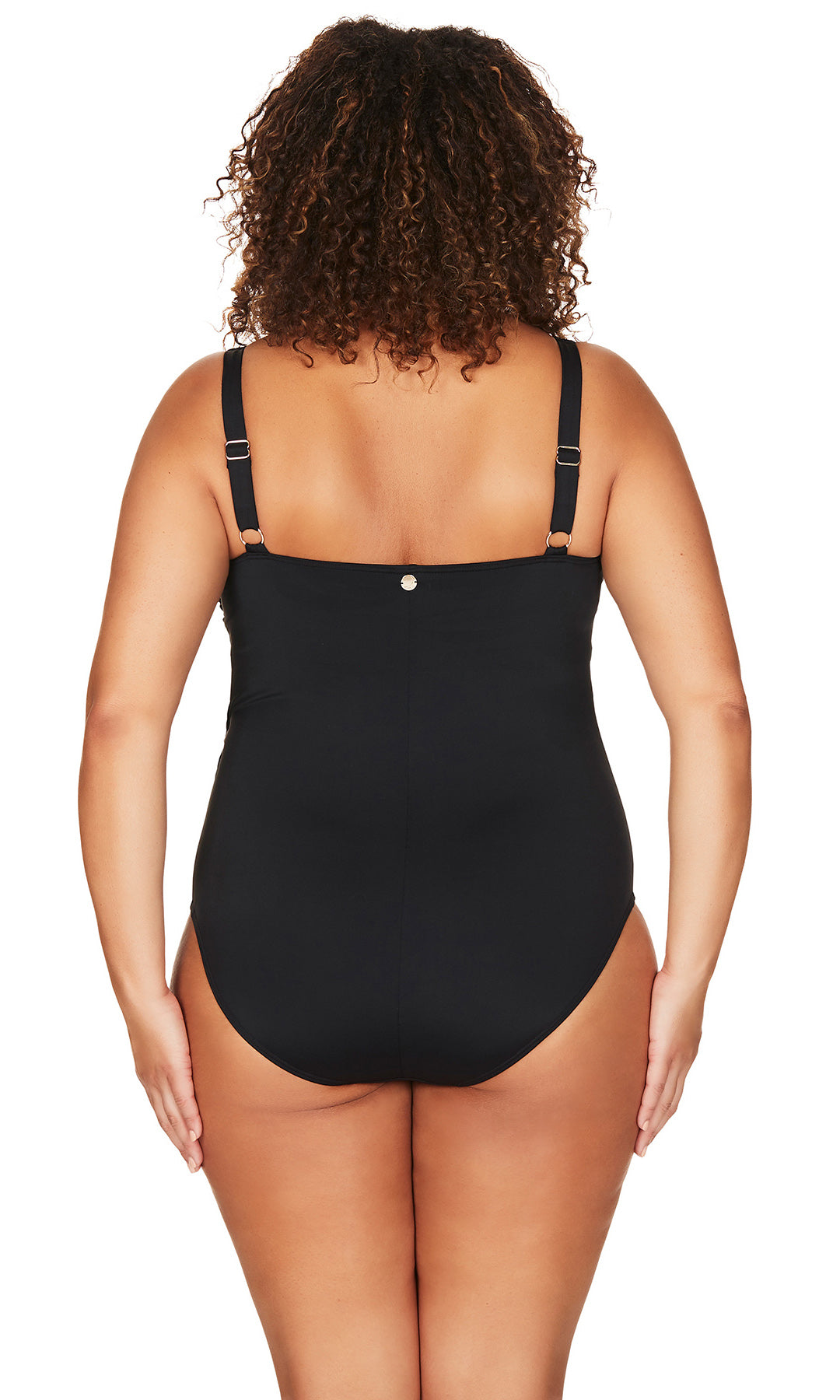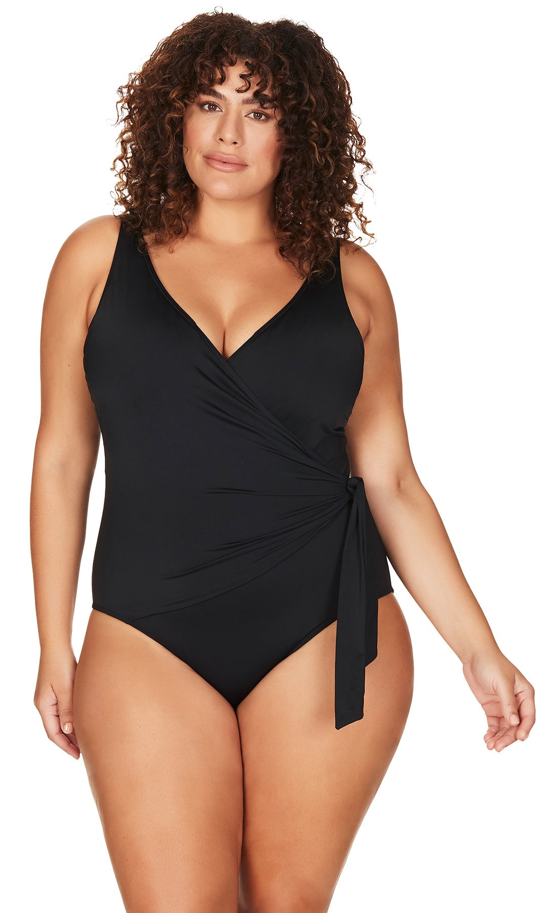 Artesands Fits Your Curves. Have curves? We have you covered in our Hayes Artesands curve fit and plus size one piece. This beautifully sculpted feminine wrap around style has a hidden shelf bra with internal support underwire to fit a D cup to DD cup, with removable soft foam cups and a front shelf bra. This one piece swimsuit has a faux cross over design with a side tie featuring the fashion look of the season. This swimsuit style allows all of the fit and support required for body sculpting and figure forming confidence for the curvy body. Our Hayes curve fit and plus size one piece has 360 degree powermesh lining and good moderate bottom coverage.