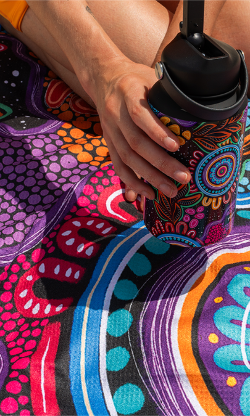 Elevate your next trip to the shore with our luxurious Sand-Free Beach Towels, each featuring stunning artwork by First Nations artists. More than just a towel, they’re a vibrant canvas that carries unique stories of artwork and creativity. Designed to bring comfort and meaning to your day, they’re the perfect companion for relaxing by the water while celebrating artistry in an ally-friendly way.