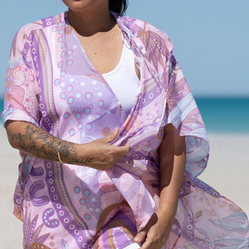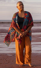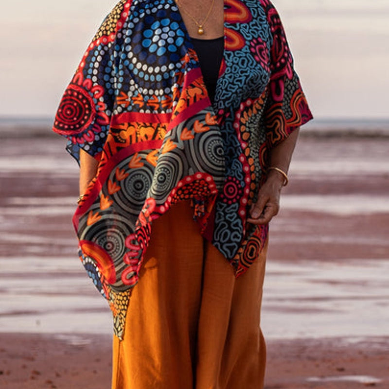 Made from light, breezy chiffon, these shawls drape beautifully, creating a soft and graceful silhouette without adding weight or bulk. The fabric catches the light as you move, enhancing the vibrant colours of the artwork and making it the perfect statement piece for any occasion.