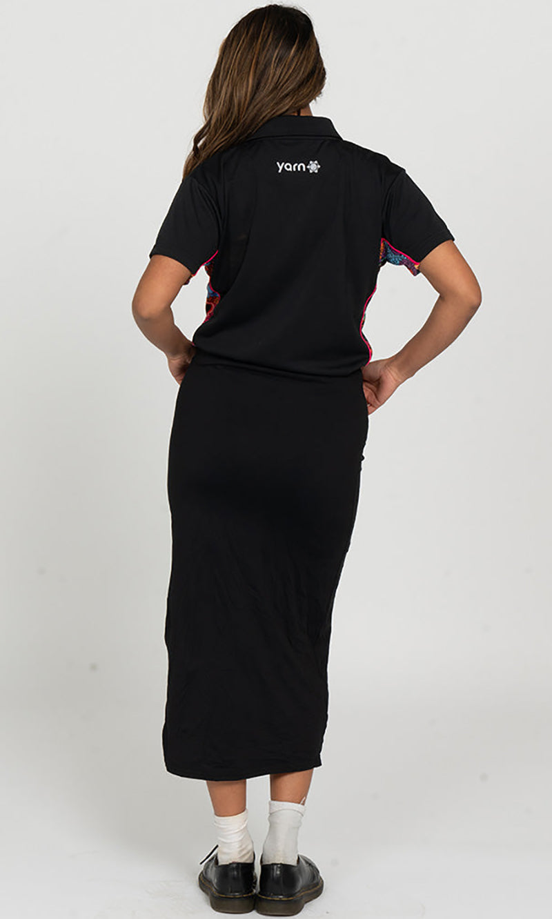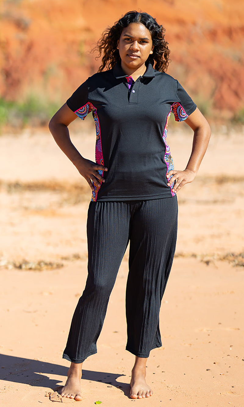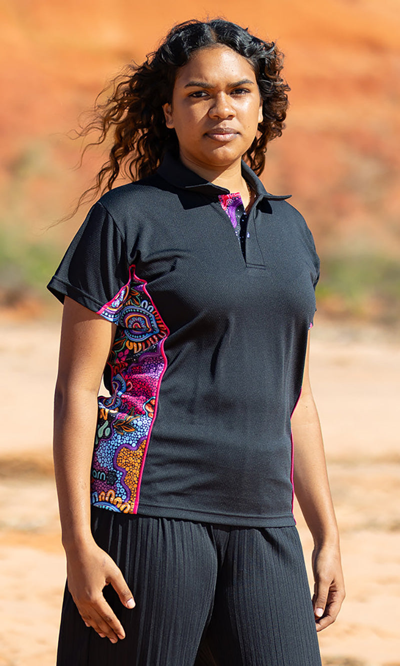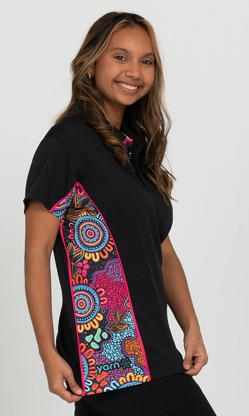 Aboriginal Art Ladies Fitted Bamboo (Simpson) Polo Celebration