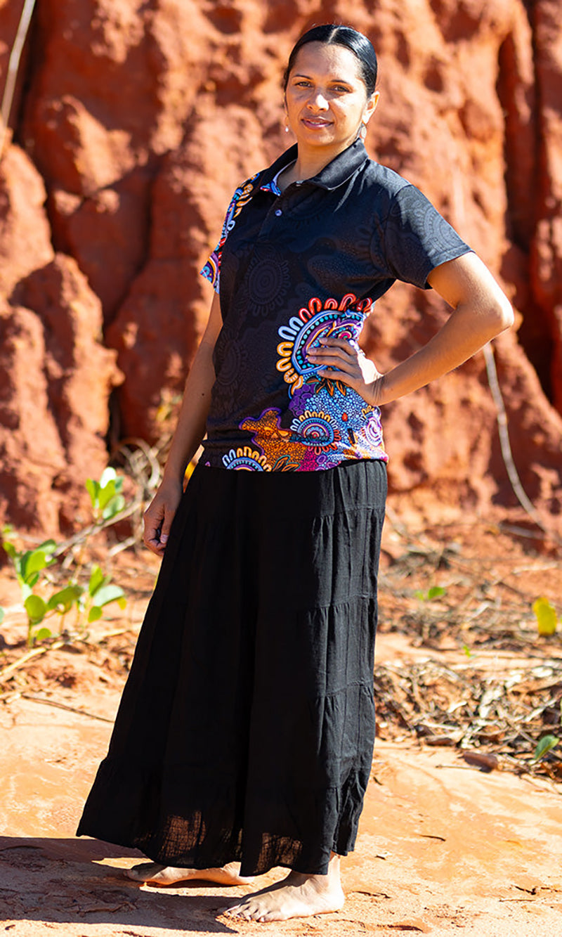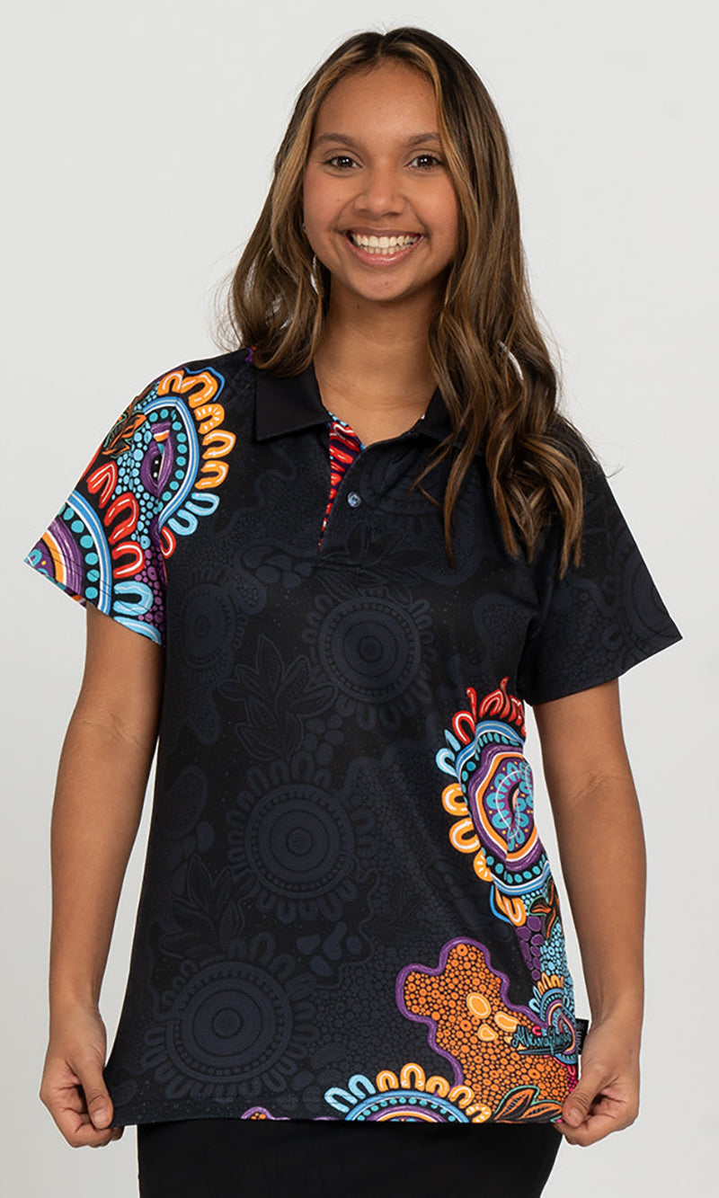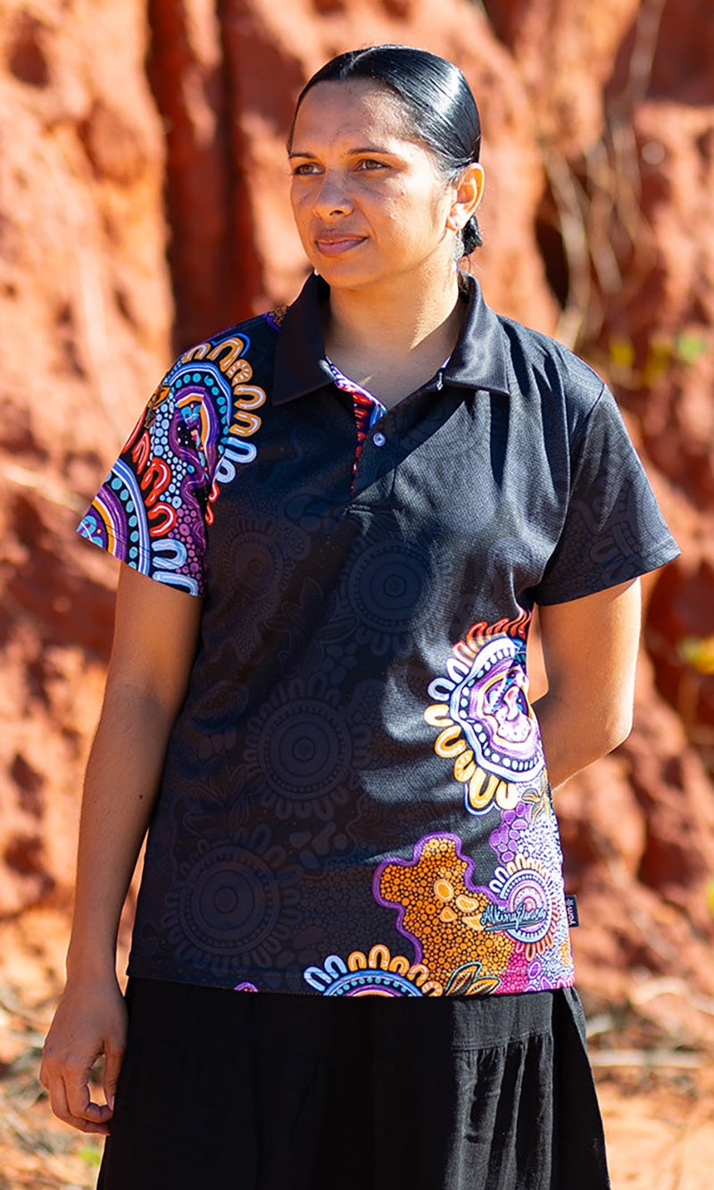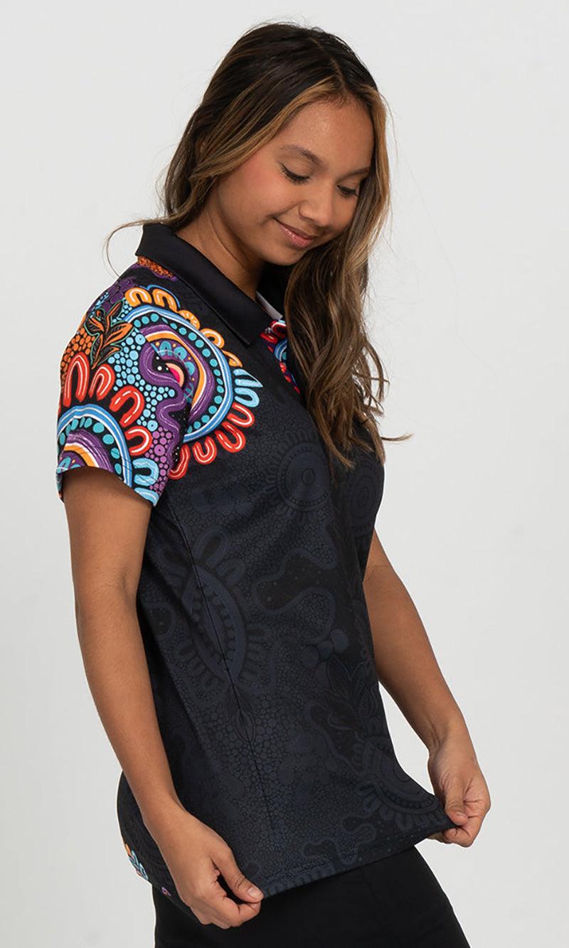 Aboriginal Art Ladies Fitted Bamboo Polo Celebration