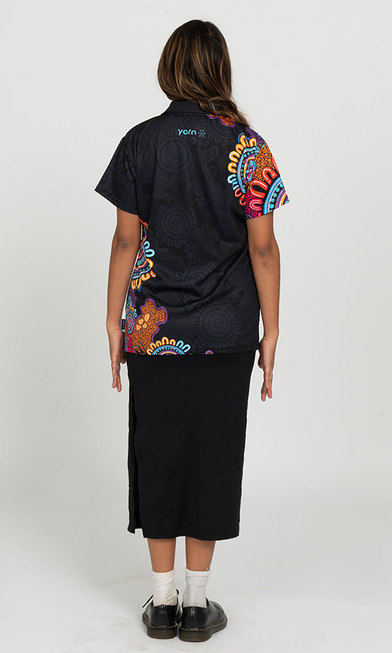 "This design represents people from all nations coming together to celebrate our beautiful cultures. With all our Elders surrounded watching the next generation grow with strong identities while they practice culture, dance, language, art and story telling." -Alkina
