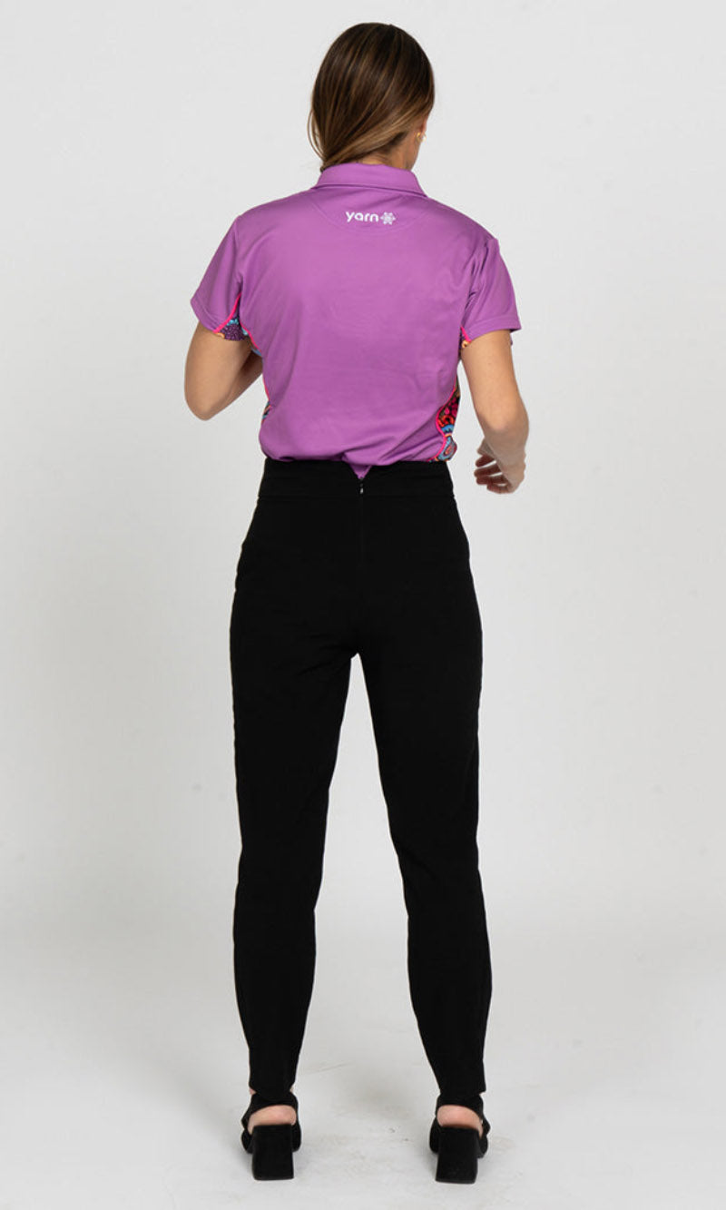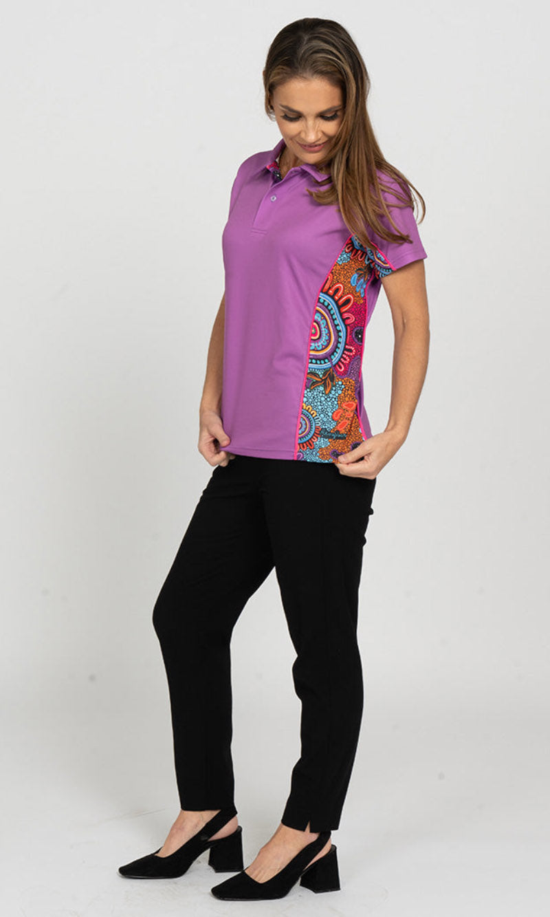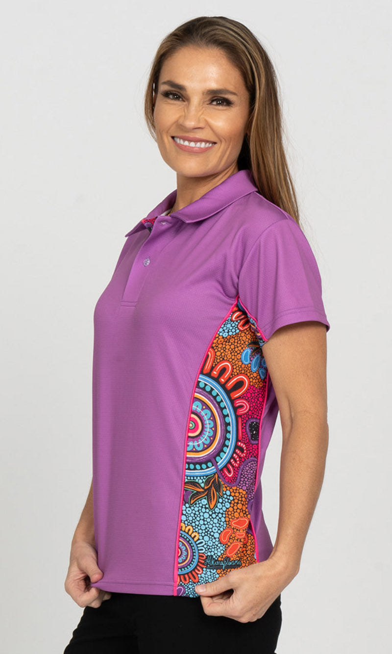 Aboriginal Art Ladies Fitted Polo Bamboo (Simpson) Celebration Purple