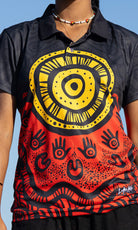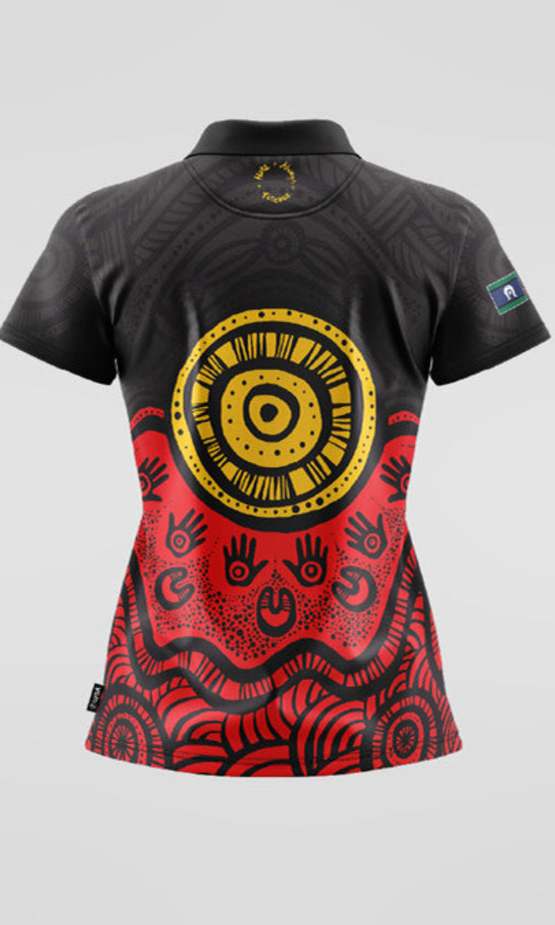 Aboriginal Art Ladies Fitted Polo Here, Always, Forever