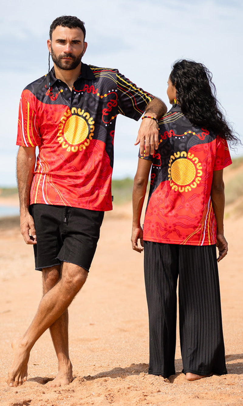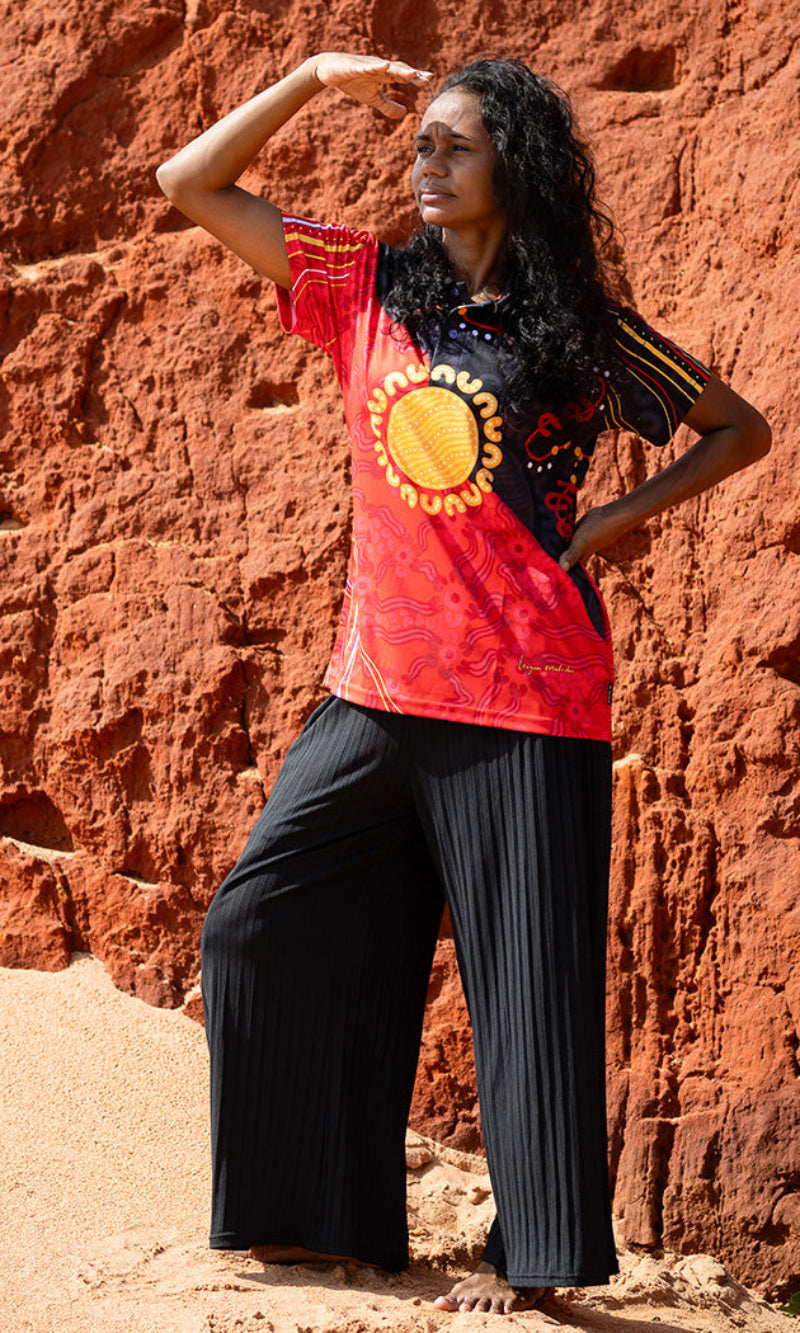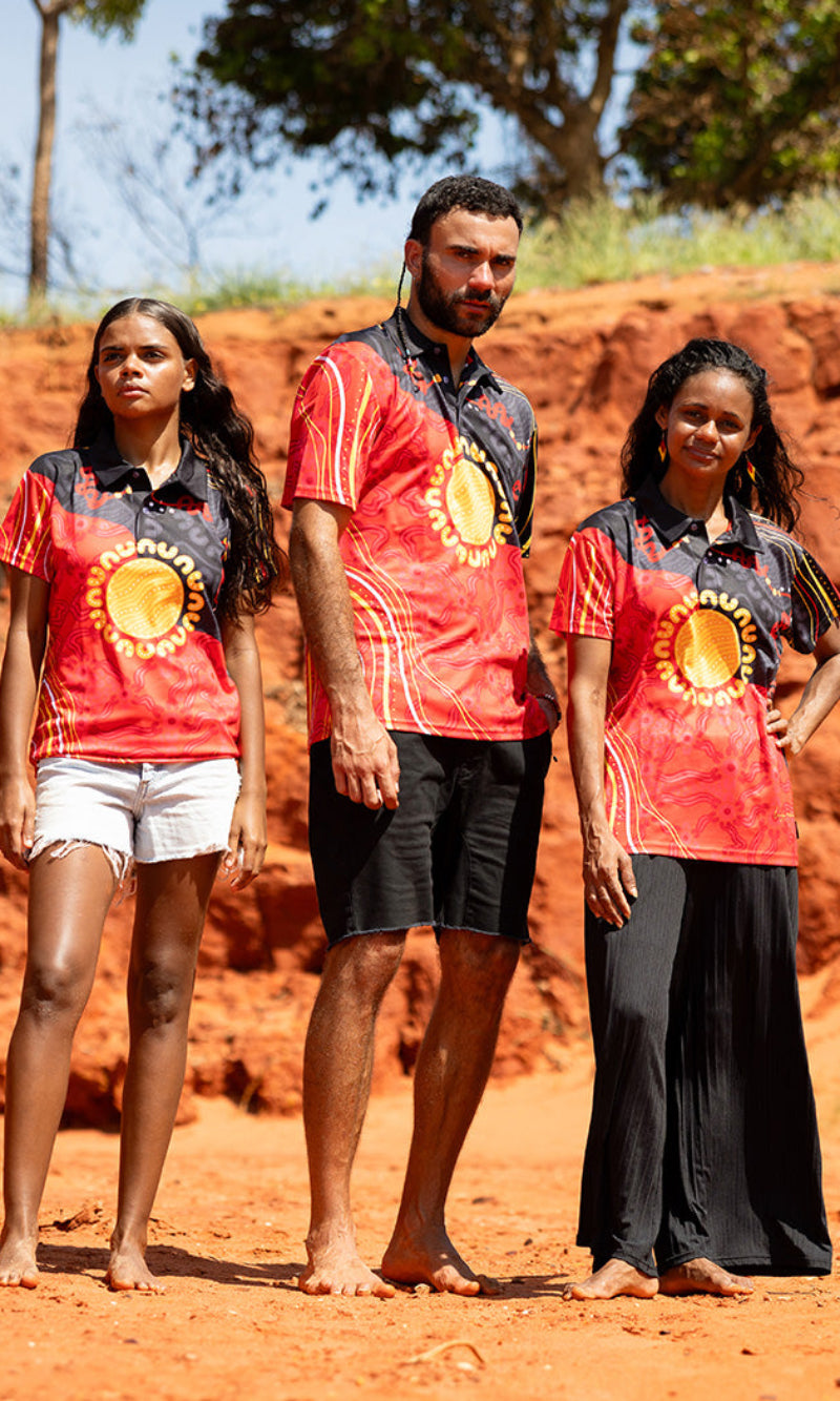 "A flag-inspired design with community and connection at its centre. Hand in hand around the sun our community gathers on Country for rejuvenation and healing. The suns fingerprint echoes through our skin, while our stories decorate the red earth." - Teagan