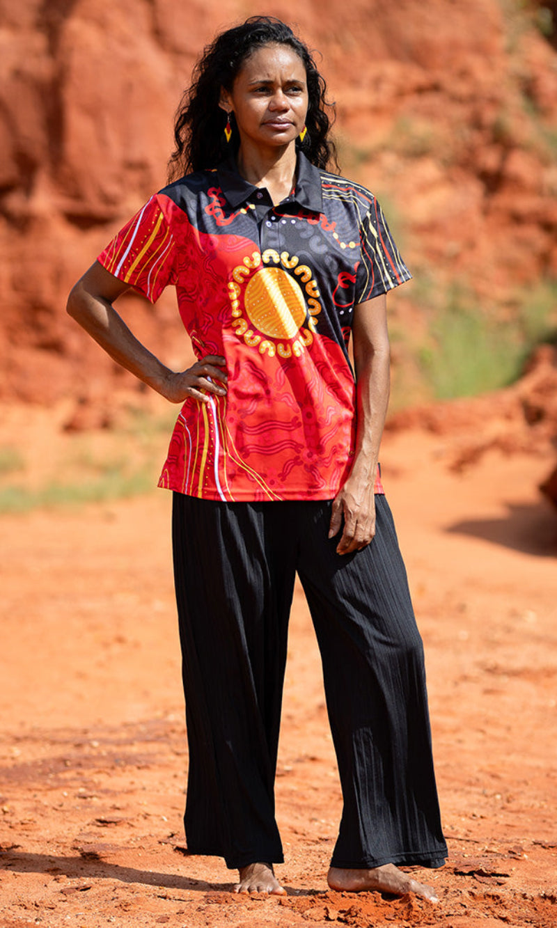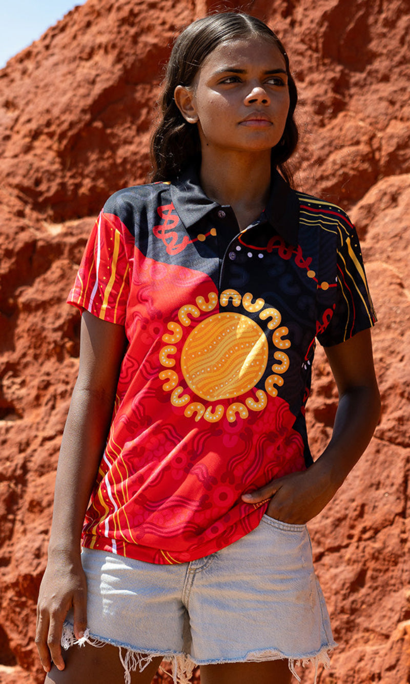 Aboriginal Art Ladies Fitted Polo Sun Soaked Aboriginal Flag