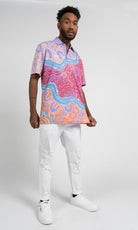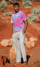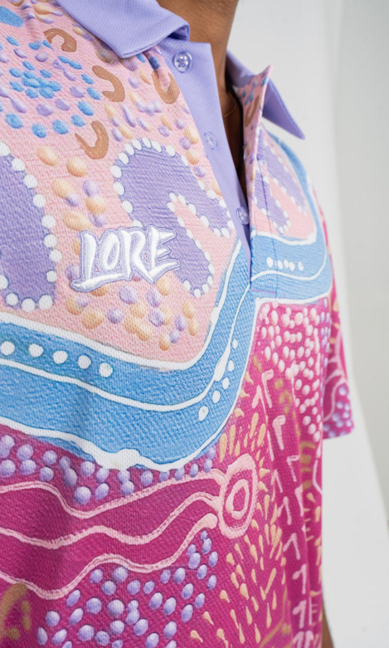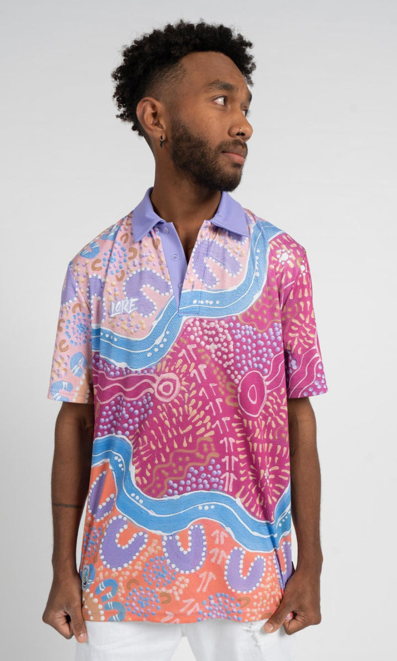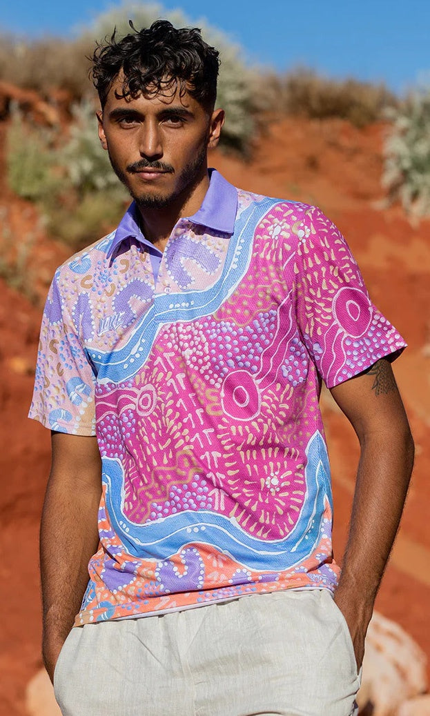 Crafted from 100% recycled Polyester, these unisex polos give you strong sun protection and a stylish and comfortable look that can be worn anywhere. Our unisex polos are designed to fit anyone and feature gorgeous Indigenous designs. This unisex polo shirt features ‘River Camps’, a gorgeous artwork by Barkindji Woman Caitlyn Davies-Plummer.